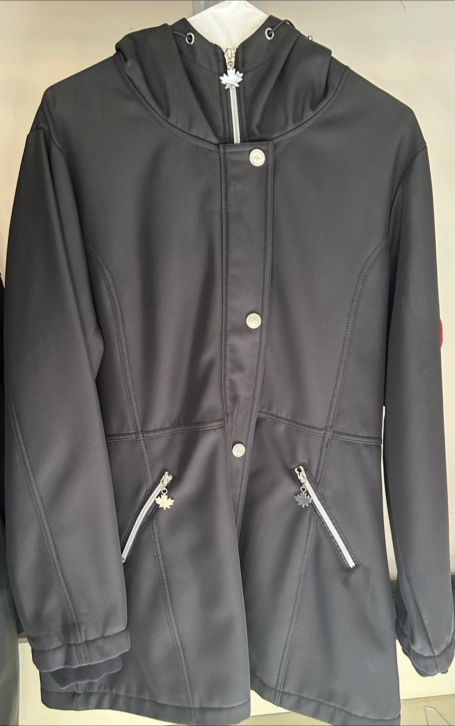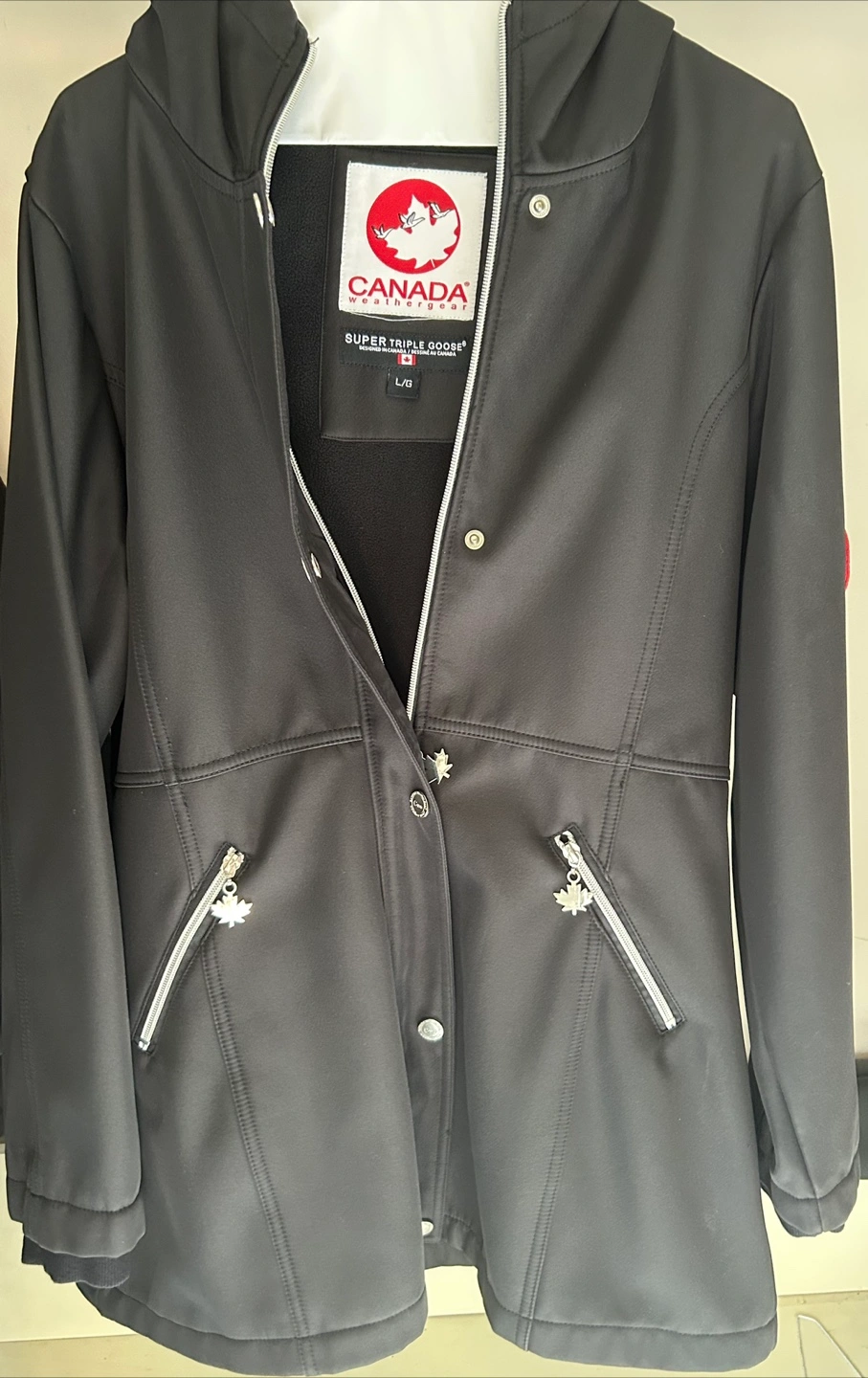 Selling a Canada Weather Gear softshell jacket in great condition! It's a size L and features a hood and several zippered pockets with maple leaf charms. Perfect for light weather protection! 🥕