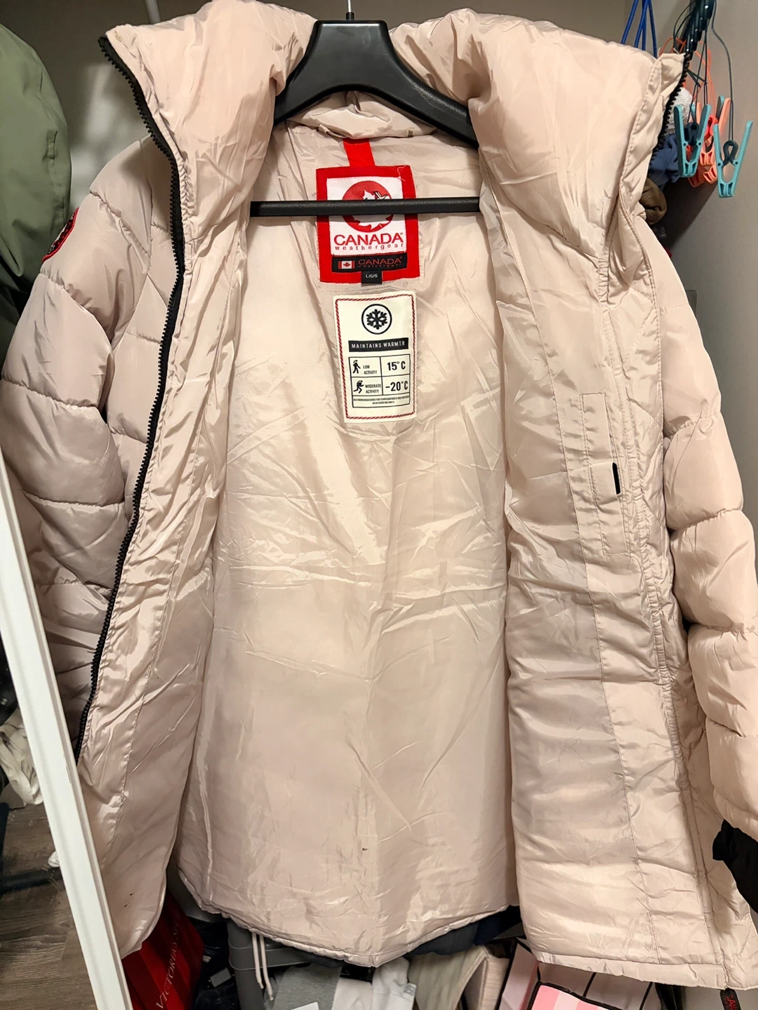 244Selling a Canada Weathergear puffer jacket in size large. It's a light pink colour and maintains warmth even in -20°C weather for moderate activity. Perfect for staying cozy during the Canadian winter! Pick up at 200 Sackville Street M5A0C4