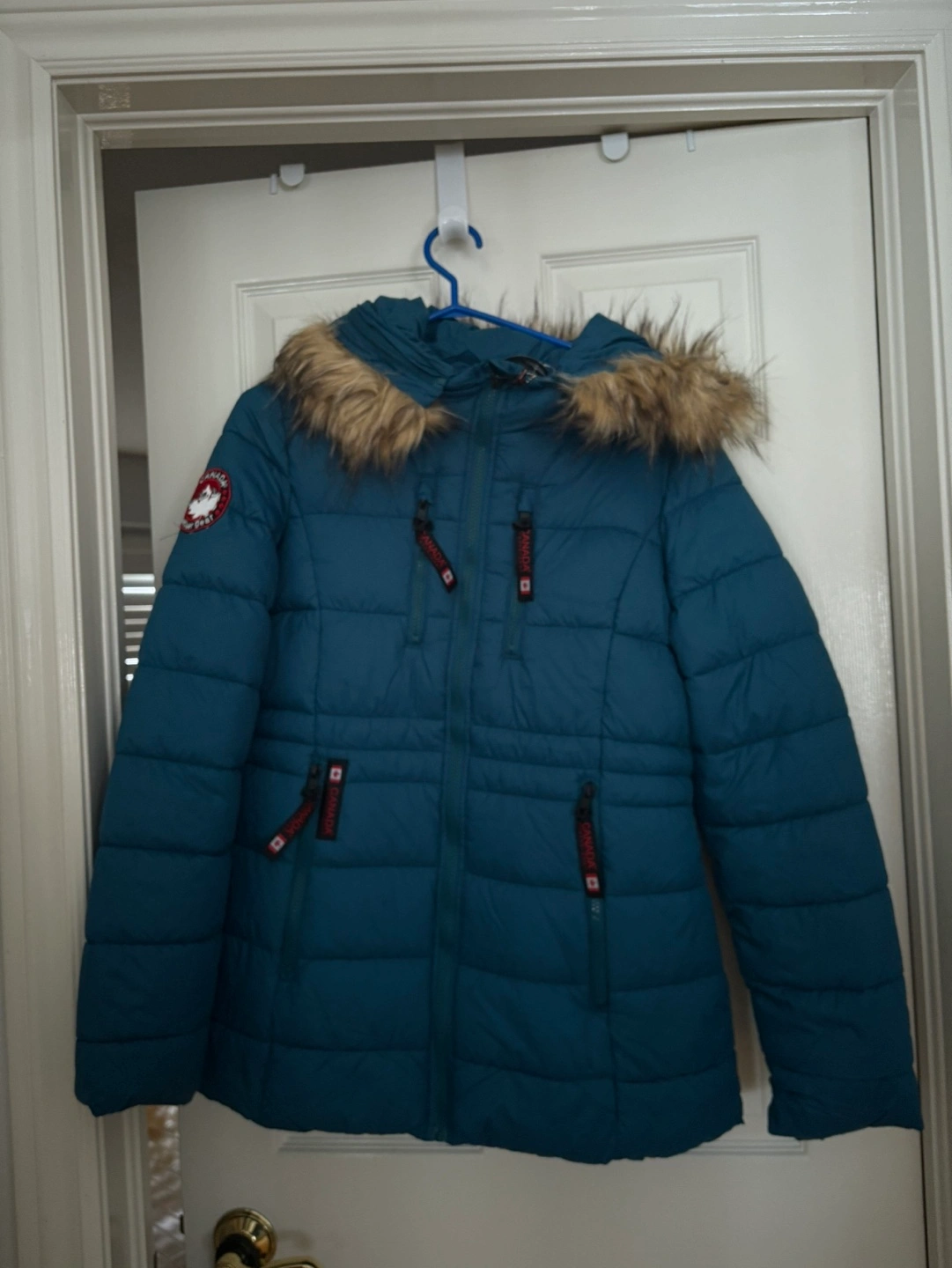 34New with tags Women's teal puffer jacket. Features a removable faux fur trimmed hood and zipper closure. Multiple pockets. Warm and comfortable. Smoke and pet free home