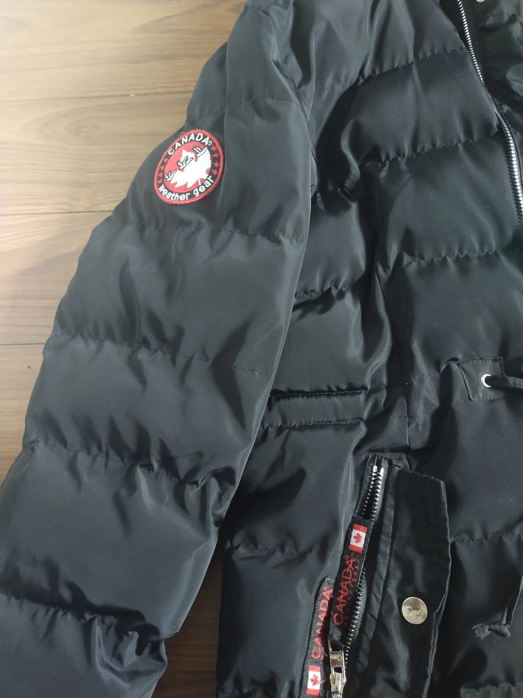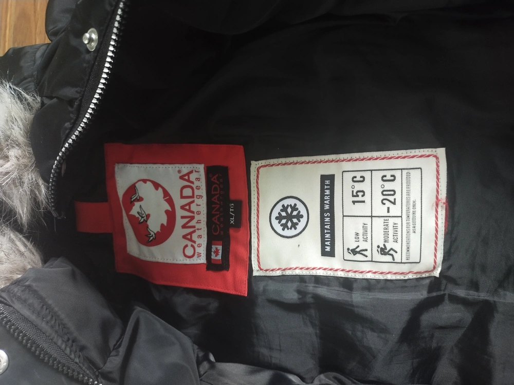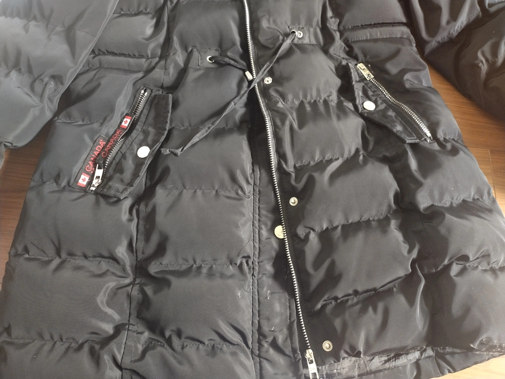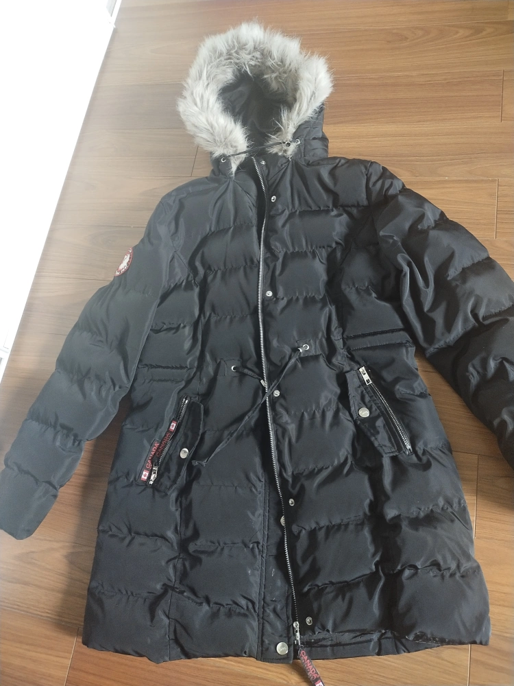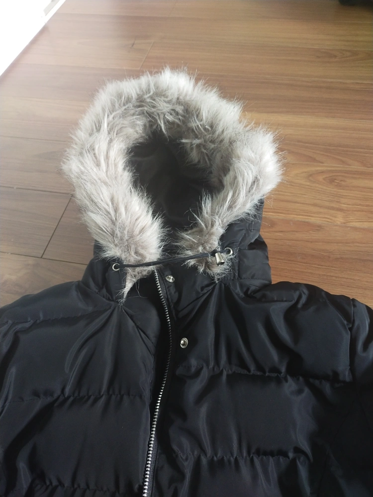 Warm winter jacket. Black colour. Features a faux fur trimmed hood. Zipper and snap closure. Multiple pockets. Size XL. Excellent for cold weather.