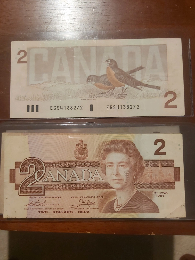 169Selling a Canadian two-dollar bill from 1986. It features a portrait of Queen Elizabeth II and a robin on the reverse side. A piece of Canadian history!
