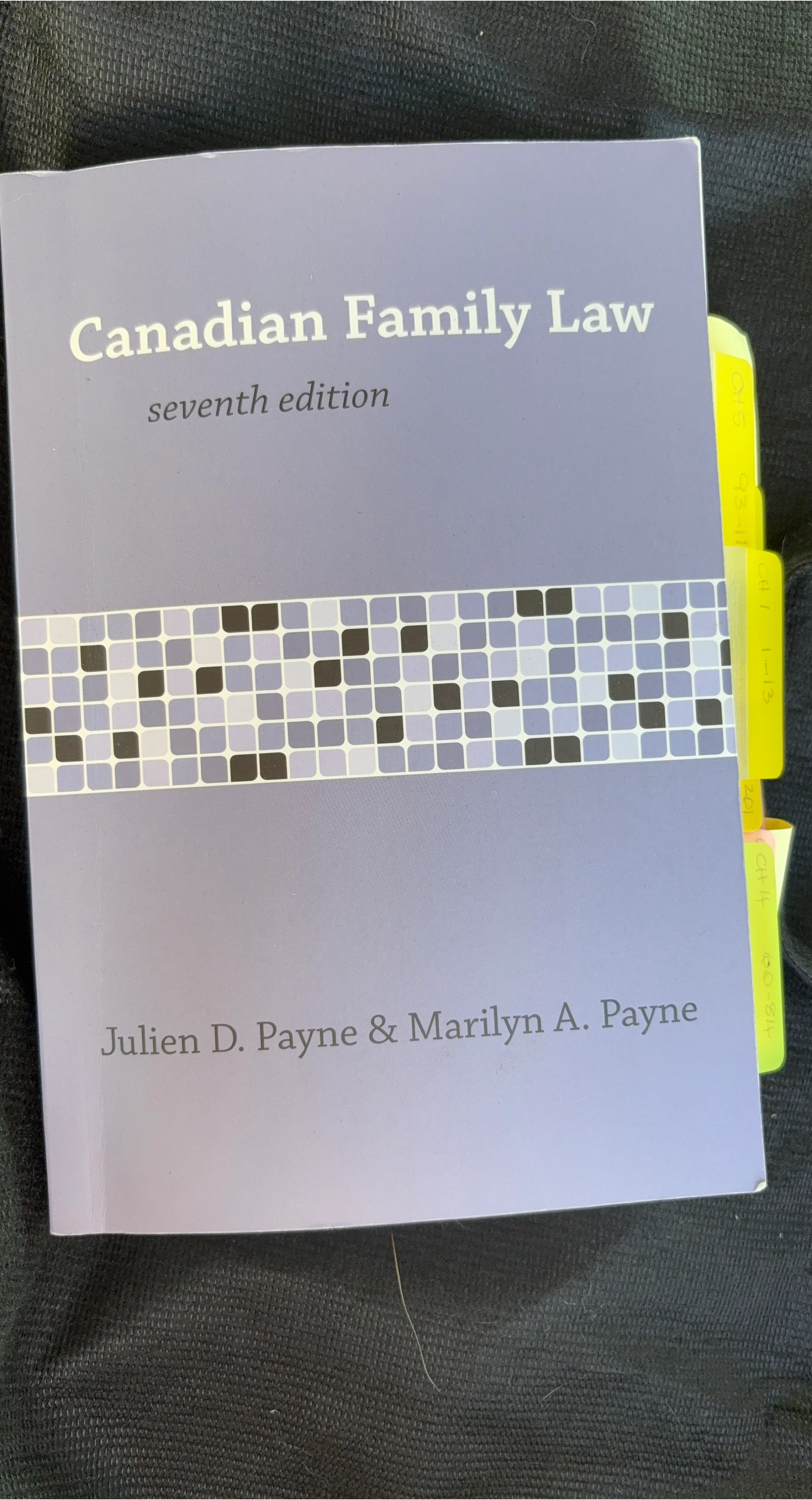 Self Representing your divorce? this is an excellent resource. Even if you have a lawyer- understand what is happening will help you save money on your divorce- via questions you don’t have to ask them. Used copy of Canadian Family Law, seventh edition, by Julien D. Payne & Marilyn A. Payne. It has some tabs to help with navigating the chapters