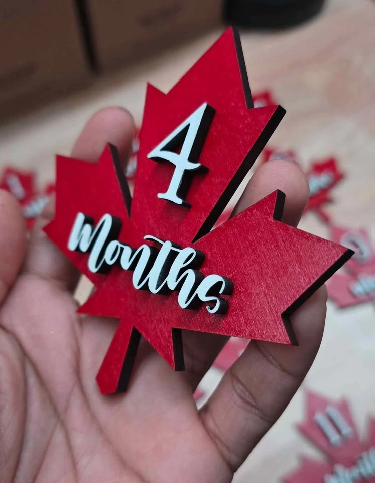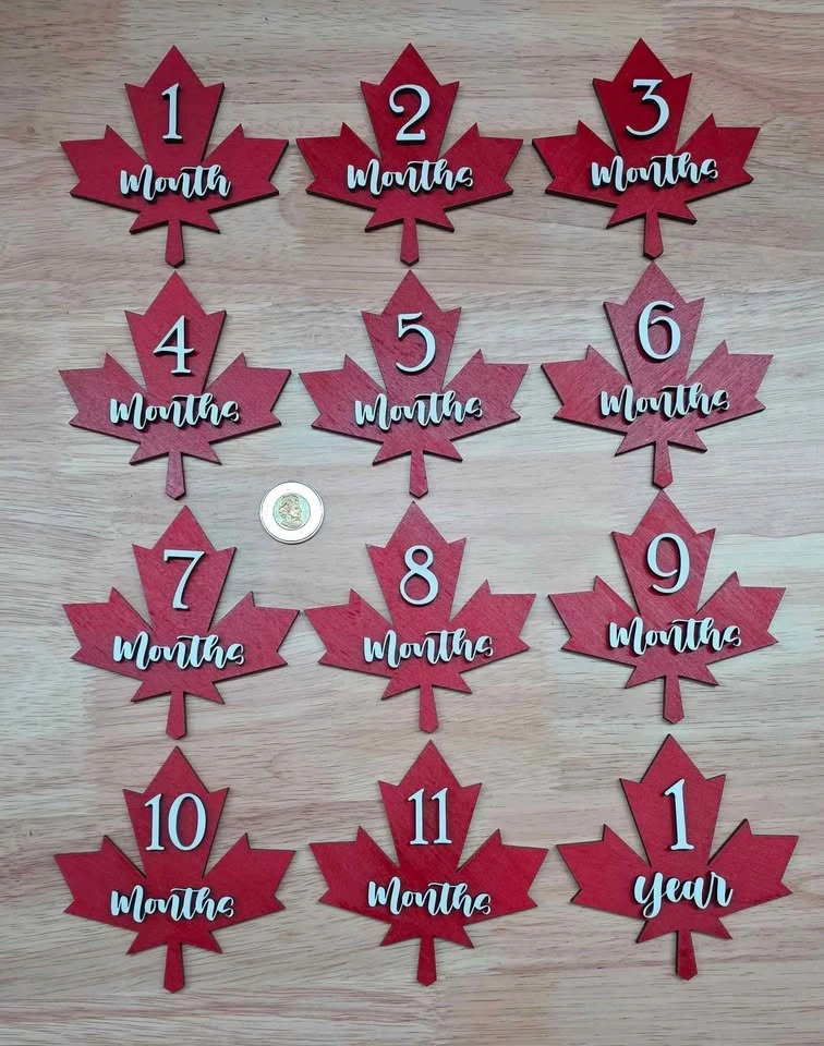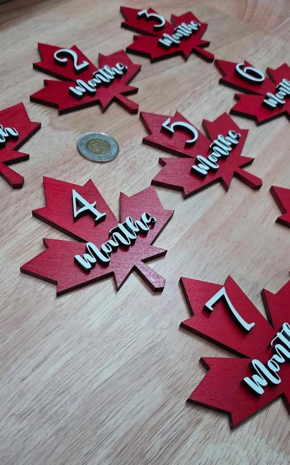 ✨ Celebrate your baby’s first year in Canadian style! ✨ This handmade 12-piece milestone set features beautifully laser-cut maple leaves (approximately 4" each), painted in classic red & white. Each piece is made with two layers of wood, creating a raised, 3D embossed effect that makes the design stand out beautifully in photos. Perfect for monthly photo shoots, memory books, or as a thoughtful baby shower gift. Each set includes: 🍁 12 milestone markers – from 1 month to 12 months(1 Year) 🍁 Painted & sealed in vibrant red & white 🍁 Two-layer design for a 3D/embossed effect 🍁 Durable 3mm maple craft wood – keepsake quality 🍁 Proudly made in Mississauga, Ontario, Canada 🇨🇦 📏 Please note: Each piece measures about 4 inches, though slight variations may occur. Since these are laser-cut, a small amount of residue or soot may sometimes remain on the edges. We take care to clean each piece thoroughly, but on occasion a tiny spot may be missed. 🎁 Great for: ✔ Monthly baby photos ✔ Baby shower gifts ✔ First birthday keepsakes ✔ Canadian-themed décor 📍 Pickup at 223 Webb Drive, Mississauga (Near Square One Mall) 🙏 Thank you for supporting a Canadian small business. Your purchase helps us continue creating unique, handmade keepsakes with love and care.