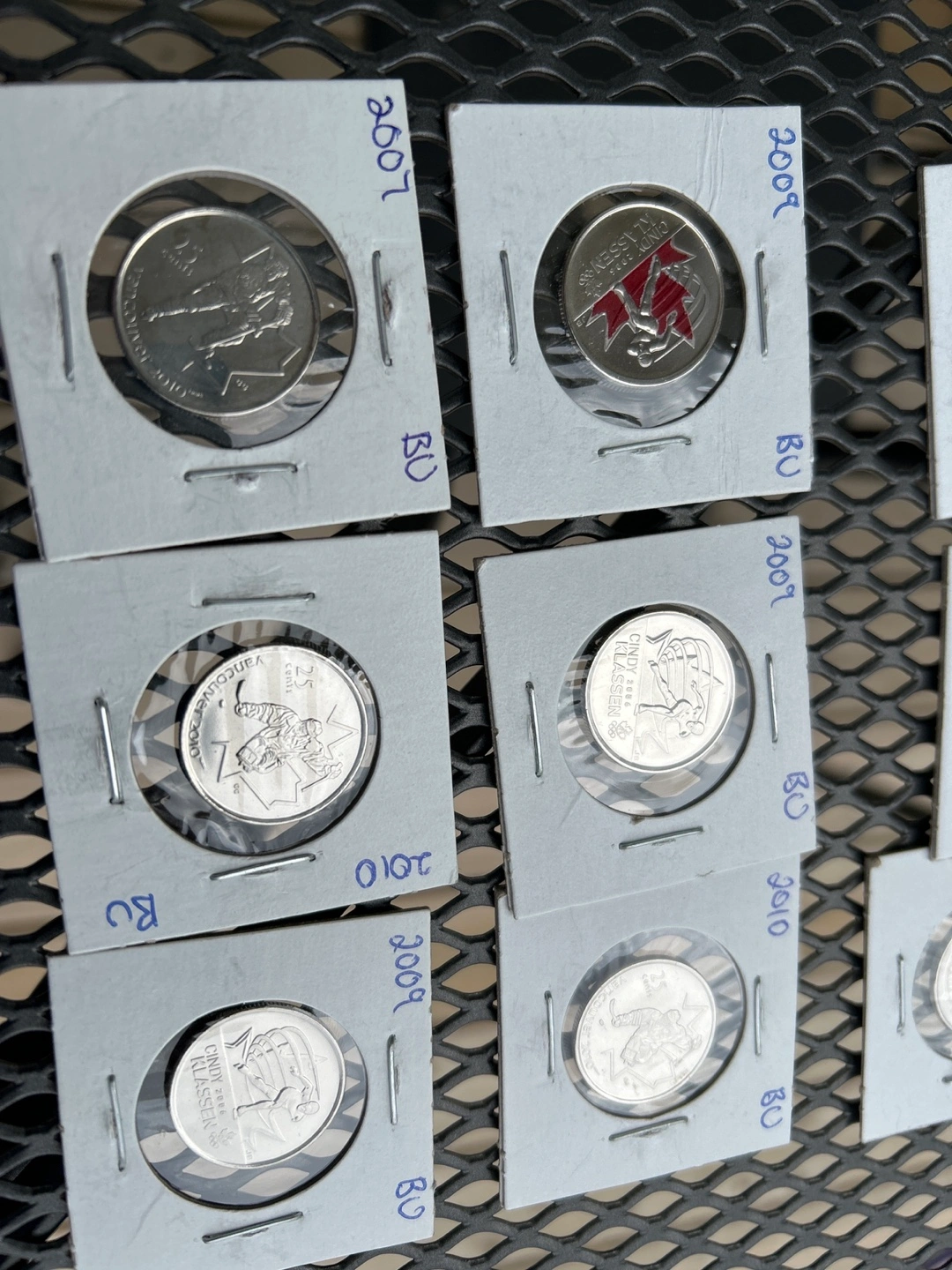 67Selling a collection of Canadian Olympic commemorative quarters. These quarters are from the Vancouver 2010 Olympics and include designs featuring various sports and athletes. They are in BU (Brilliant Uncirculated) condition and come in protective holders.