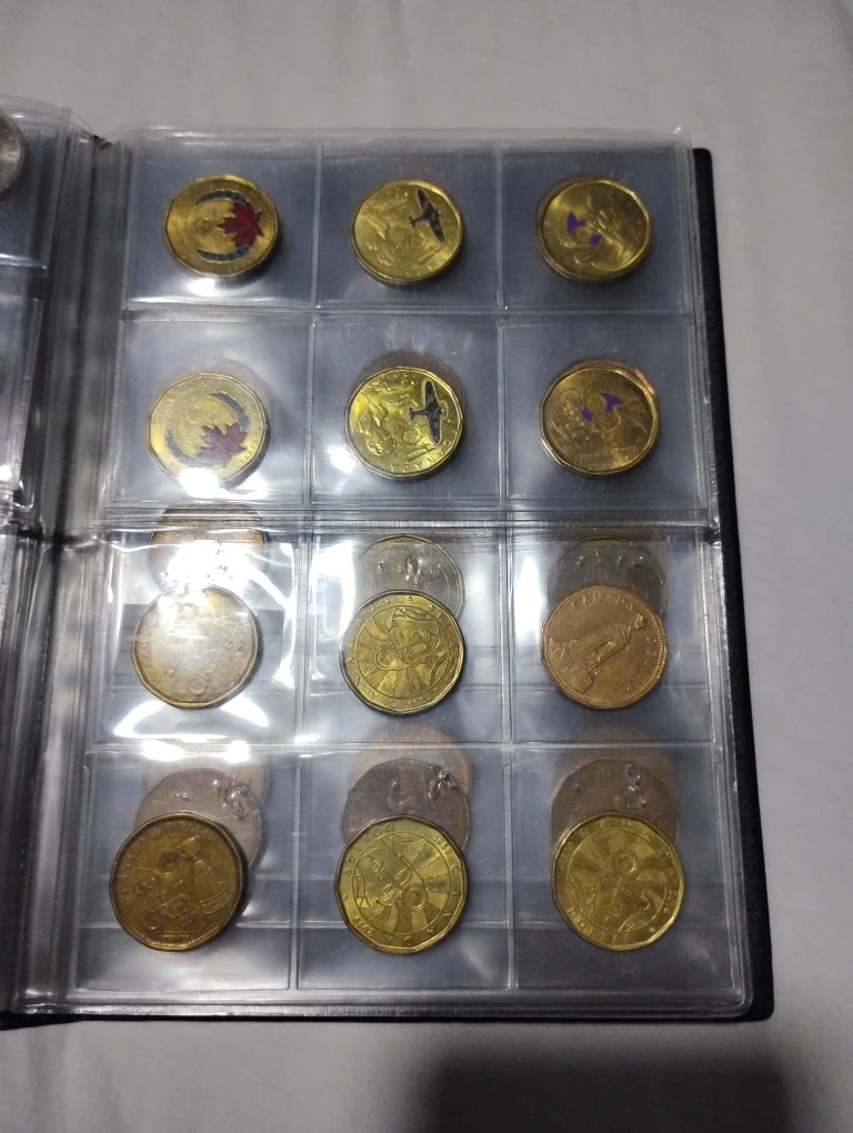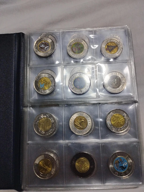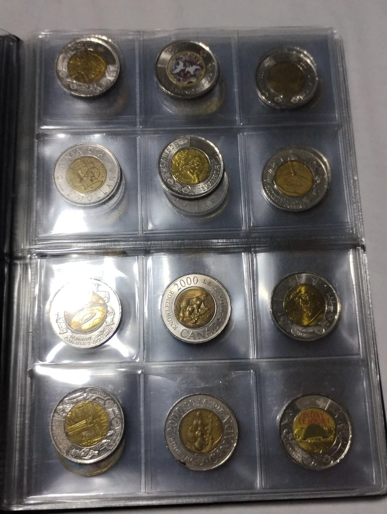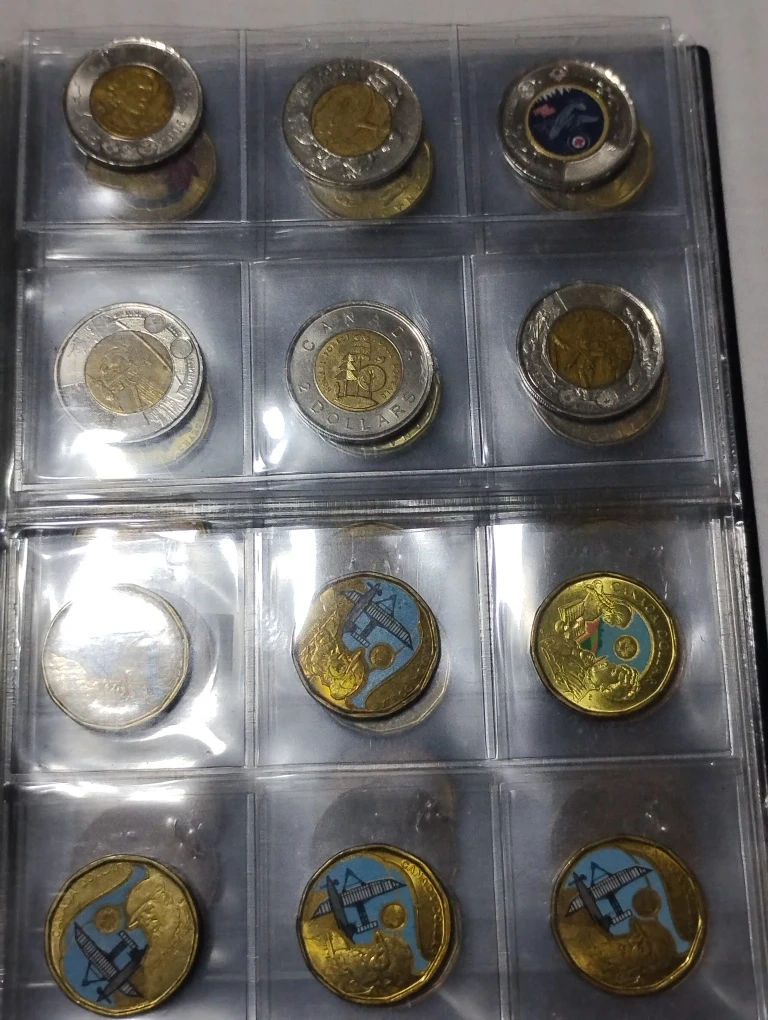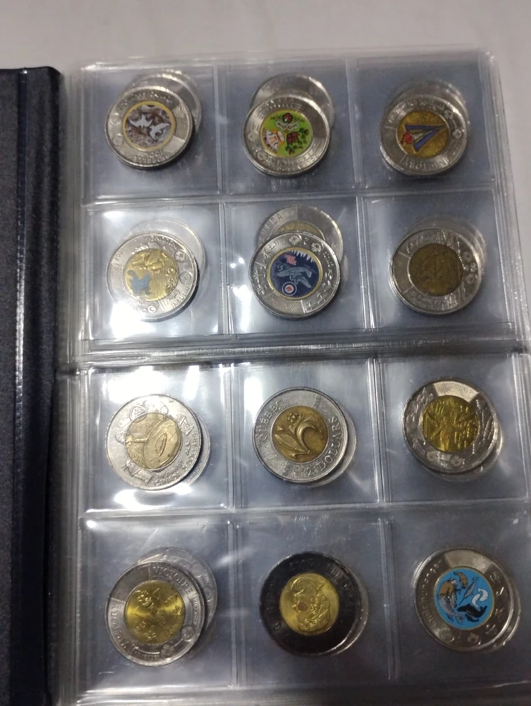 33 pieces for 2 dollars. 63 pieces for $1 dolars. collection of Canadian toonies. They are stored in a binder with individual slots for each coin. Includes various commemorative and special edition toonies.