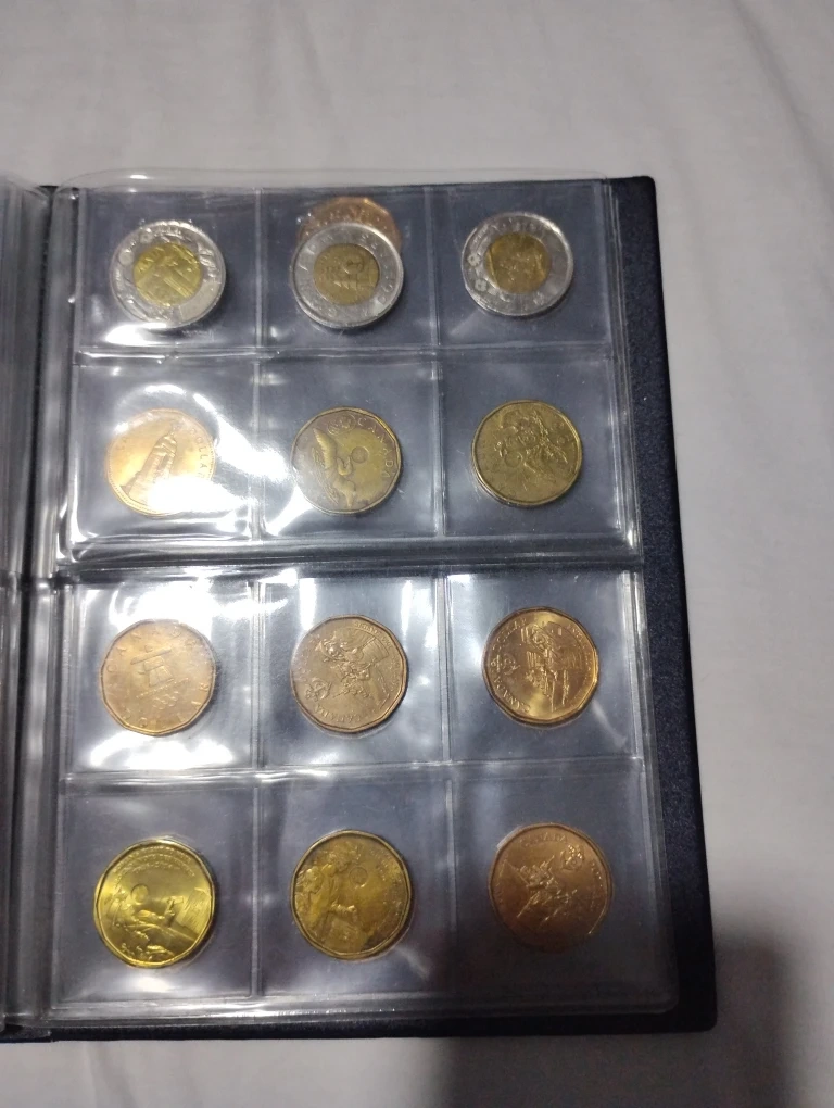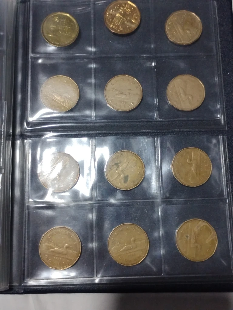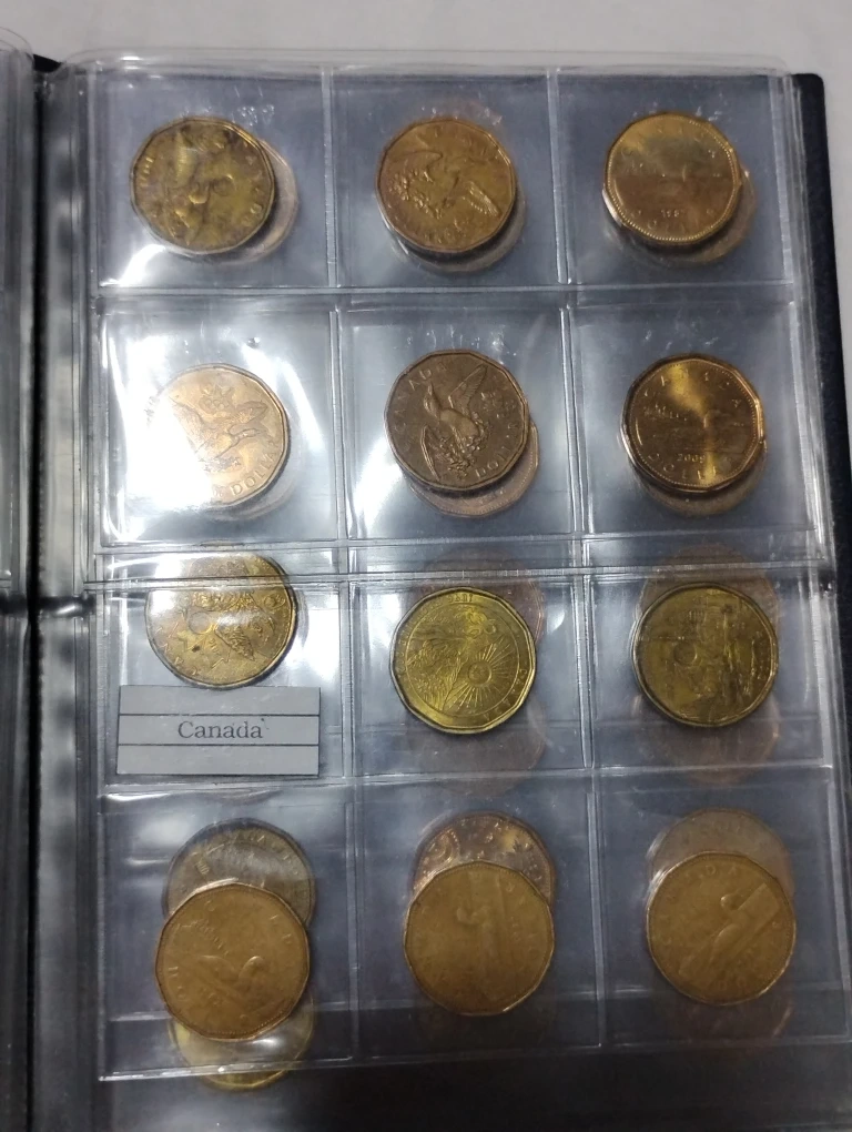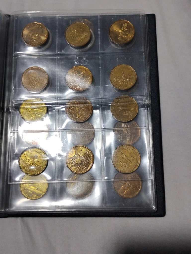 33 pieces for 2 dollars. 63 pieces for $1 dolars. collection of Canadian toonies. They are stored in a binder with individual slots for each coin. Includes various commemorative and special edition toonies.