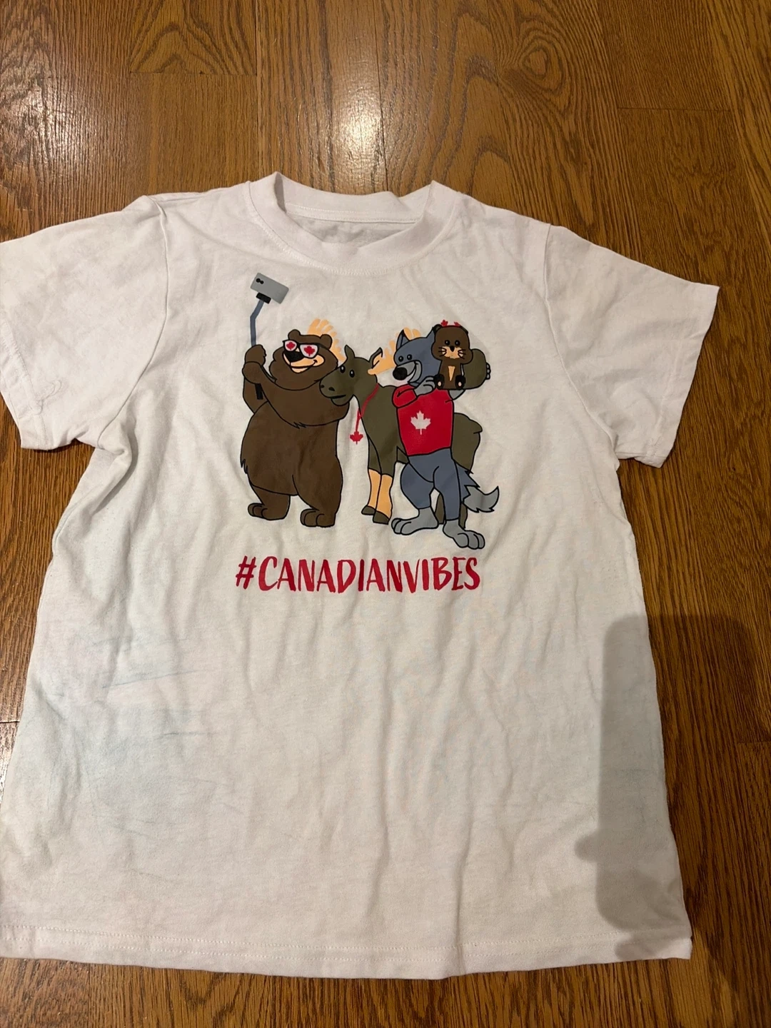 Selling a cute white t-shirt with a fun Canadian theme! It features a bear, moose, and wolf taking a selfie. The shirt also has '#CANADIANVIBES' printed on it. Perfect for showing off your Canadian pride!