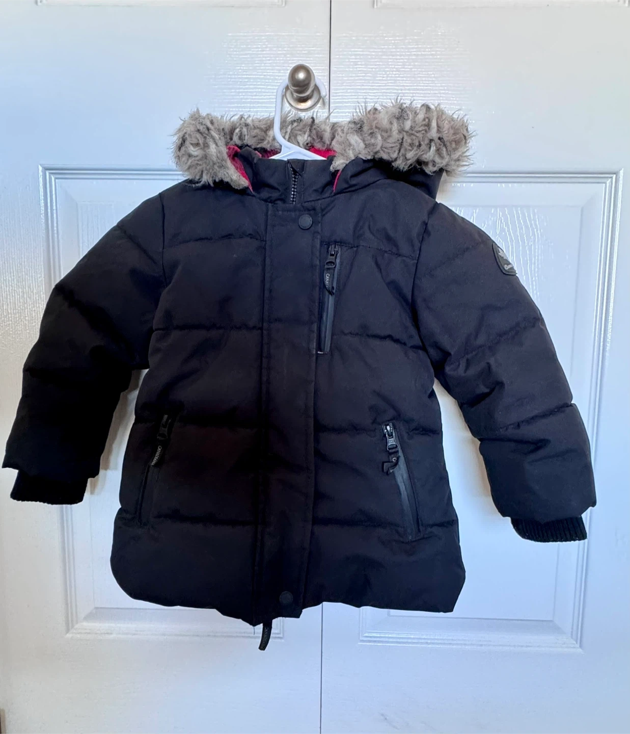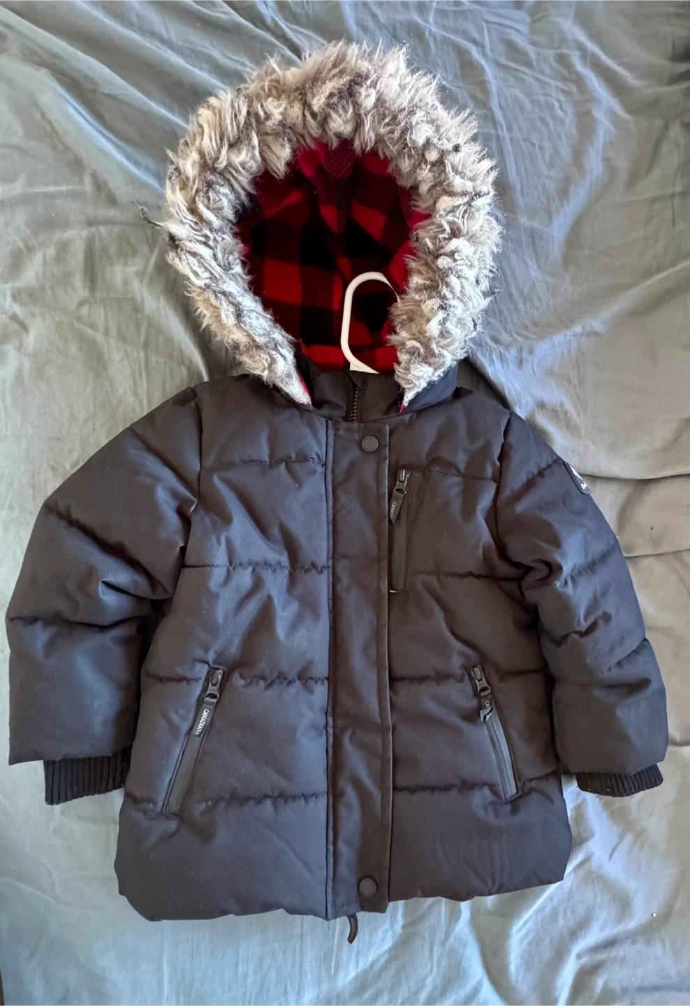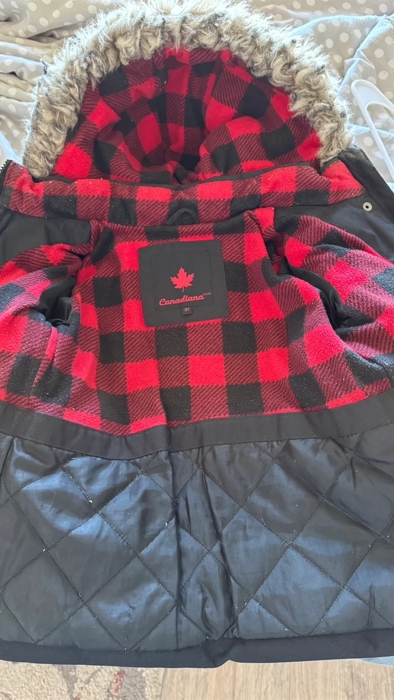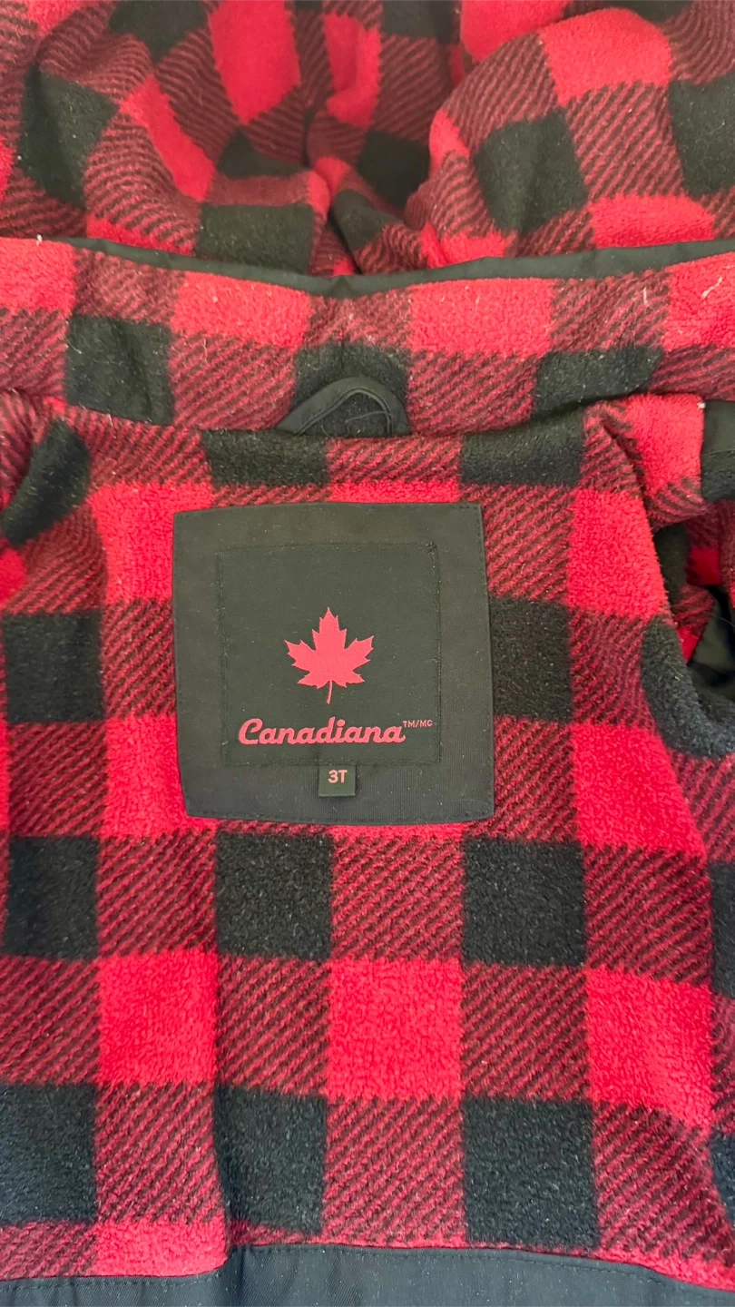 50Keep your little one warm with this cozy Canadiana winter jacket! It features a stylish black exterior and a fun red and black plaid interior. The jacket is a size 3T and perfect for those chilly Canadian days
