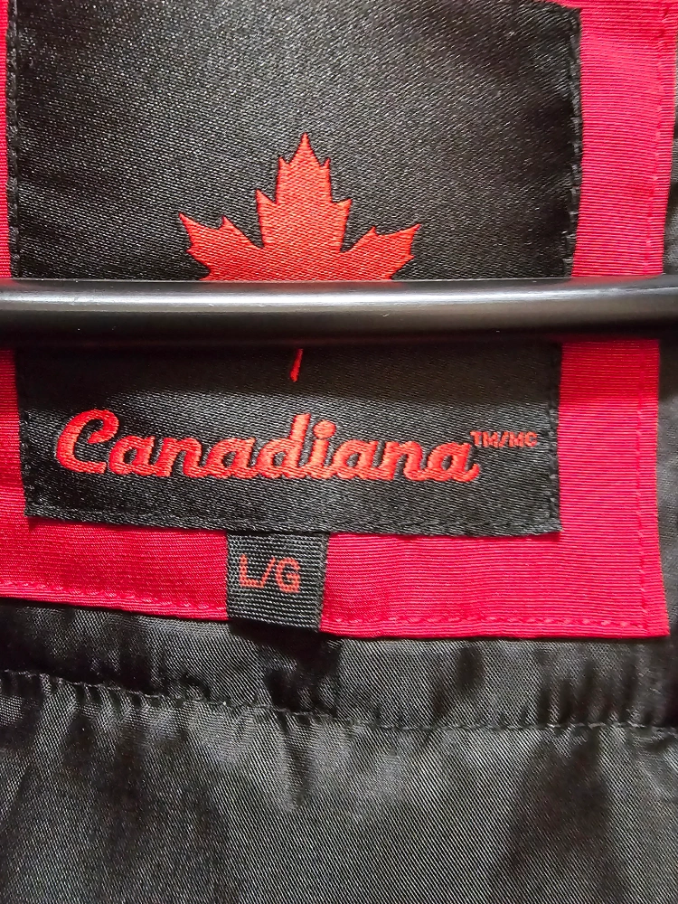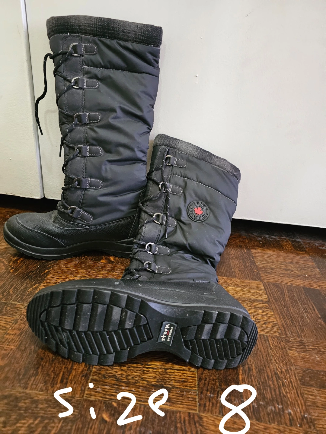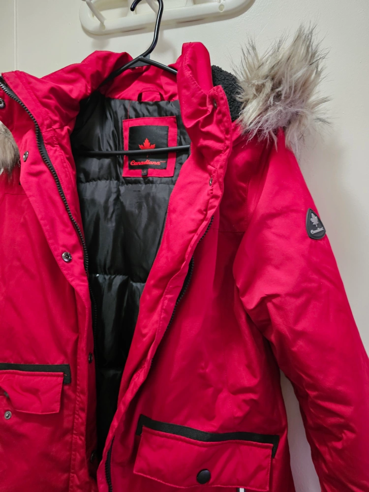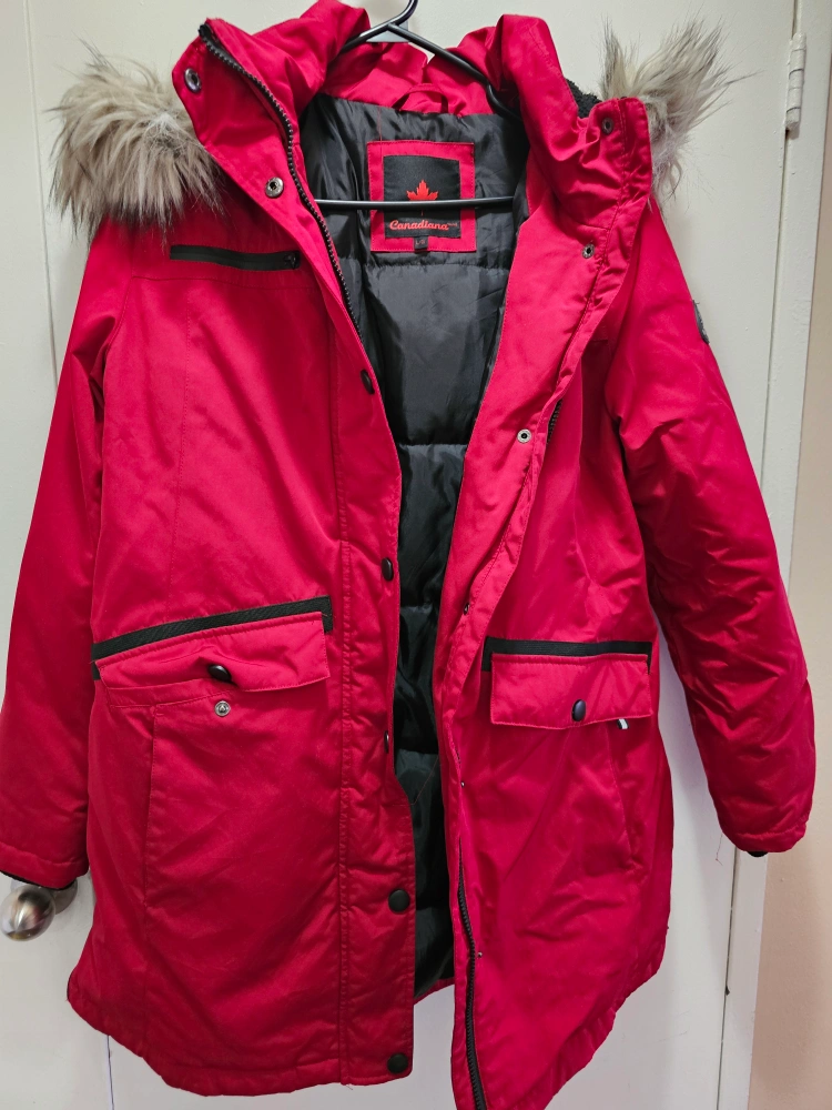 0A bright red parka jacket with a fur-lined hood. Black boots with laces. The boots are waterproof and a size 8. Put these on and take a nice relaxing walk in the snow.