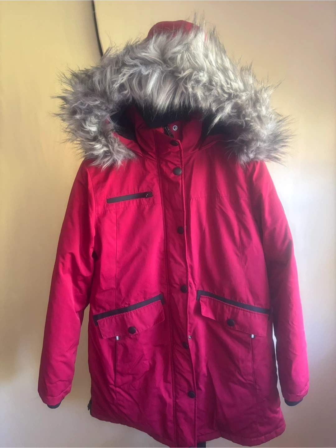 Selling a cozy well made Canadiana down feather winter parka in a vibrant red colour. It's a size L/G and features a faux fur trim on the hood (with cozy fleece lining to keep your head warm). Perfect for staying warm during the colder months! Never worn! Size (armpit to armpit) 22 inches