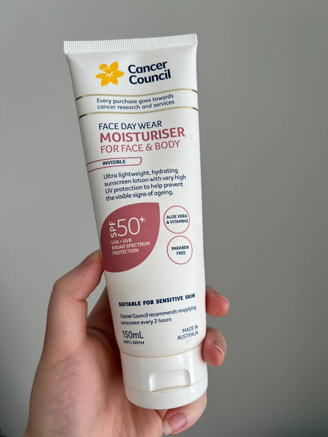 I'm selling a Cancer Council Face Day Wear Moisturiser for Face & Body. It's an ultra lightweight, hydrating sunscreen lotion with very high UV protection to help prevent the visible signs of ageing. It's SPF 50+ and provides UVA UVB broad spectrum protection. Suitable for sensitive skin and contains aloe vera and vitamine. 1/3 left