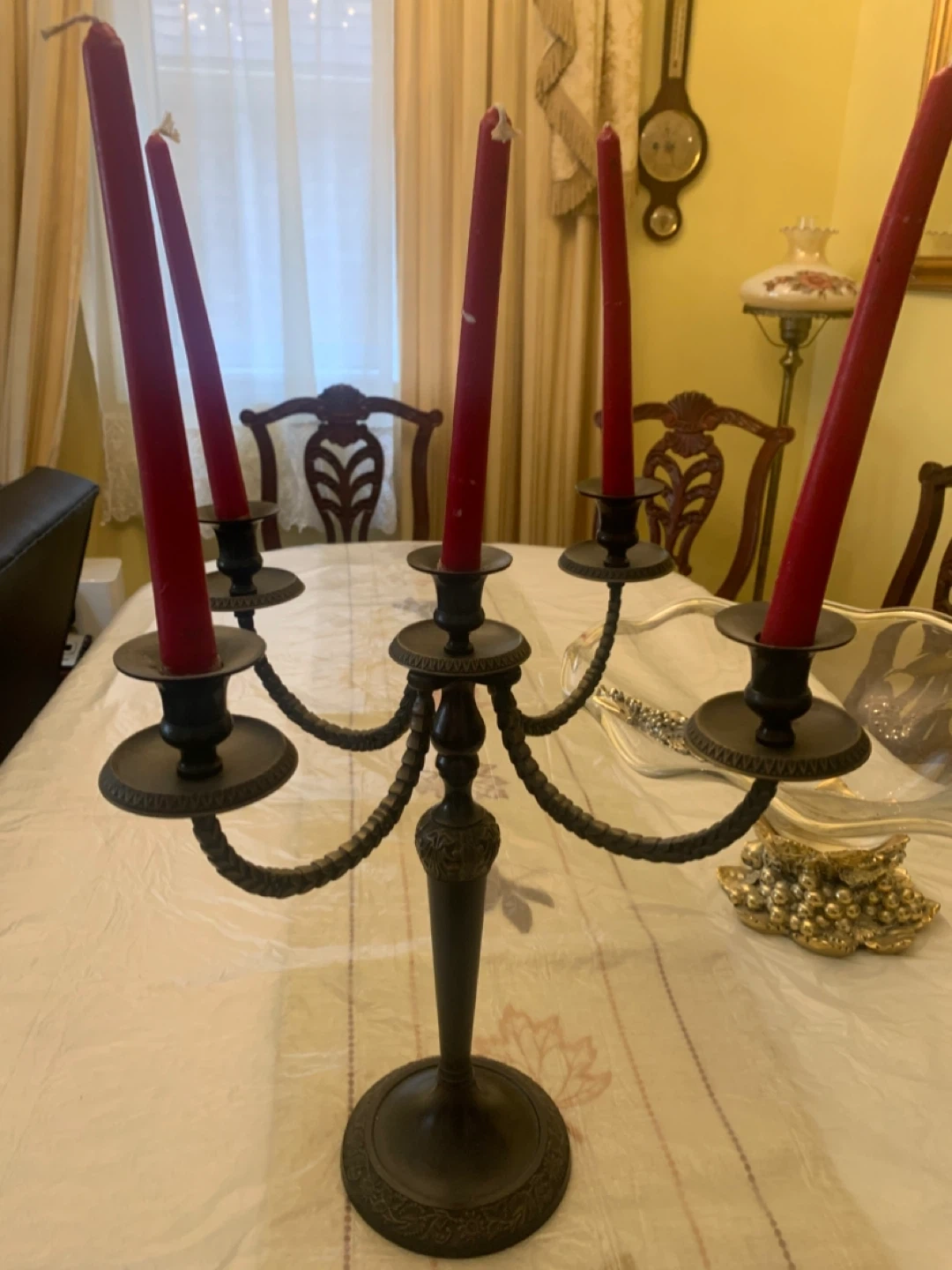 0I'm selling a candelabra that holds five candles. It comes with the red candles shown in the photos. It would make a lovely centrepiece for a dining table or mantelpiece!