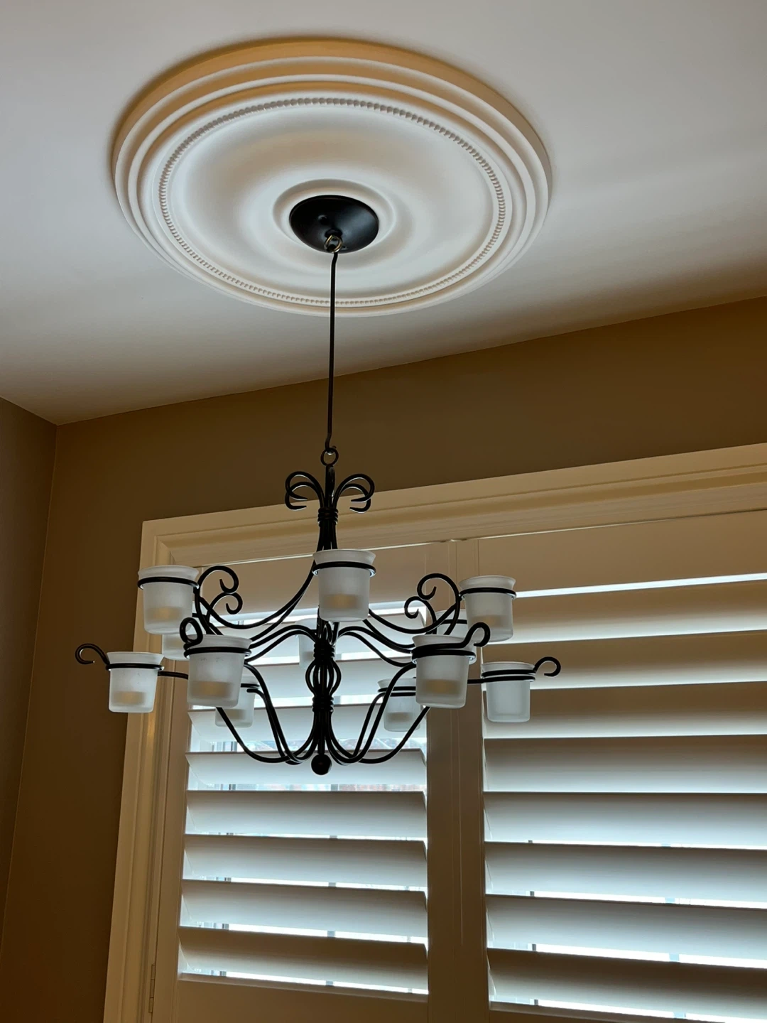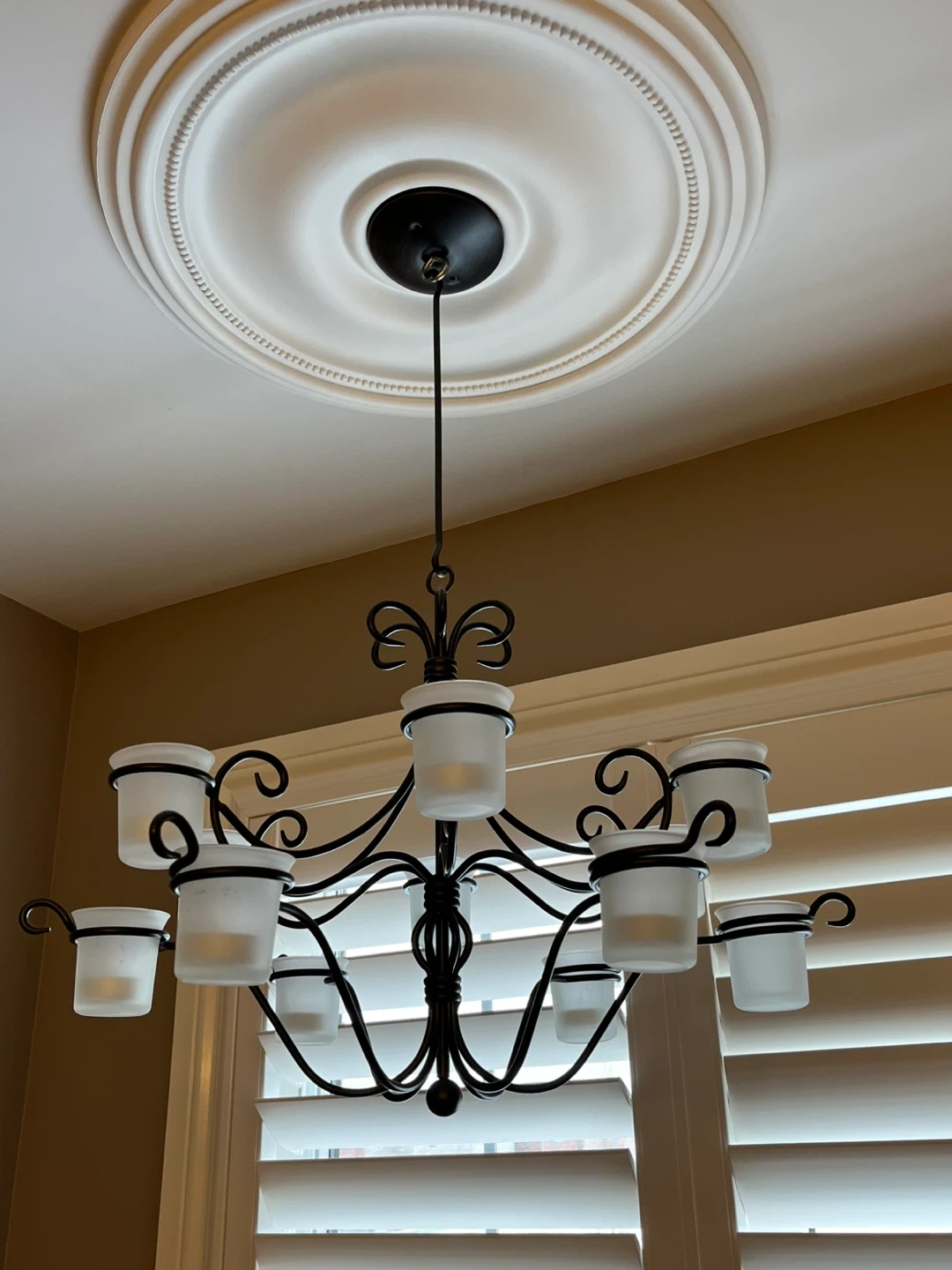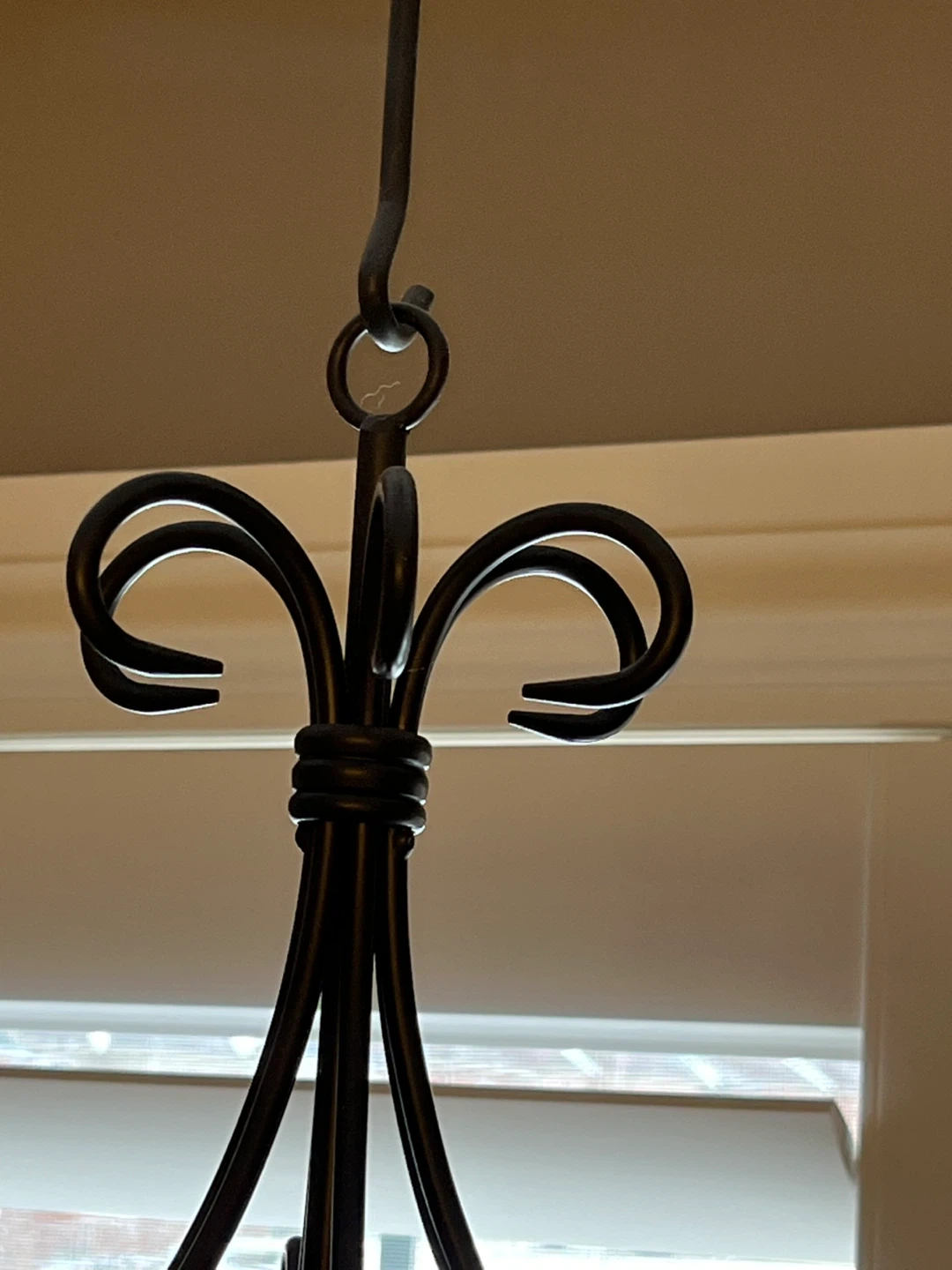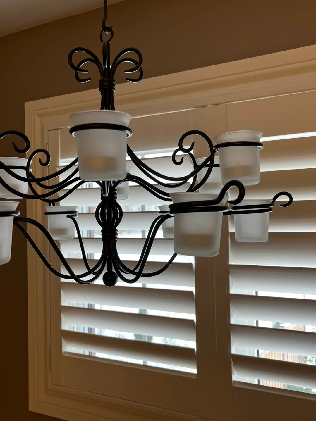 65Selling a beautiful wrought iron candle chandelier! It features elegant, curly details and frosted glass shades that provide a soft, diffused light. Perfect for adding a touch of sophistication to any room- smoke free home