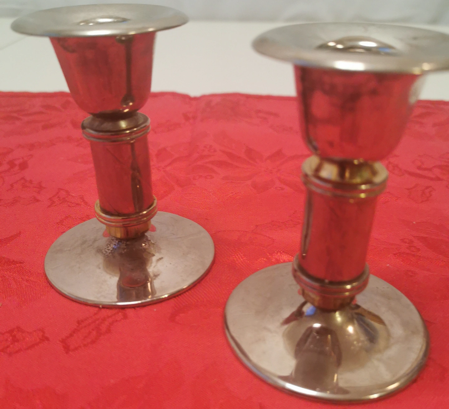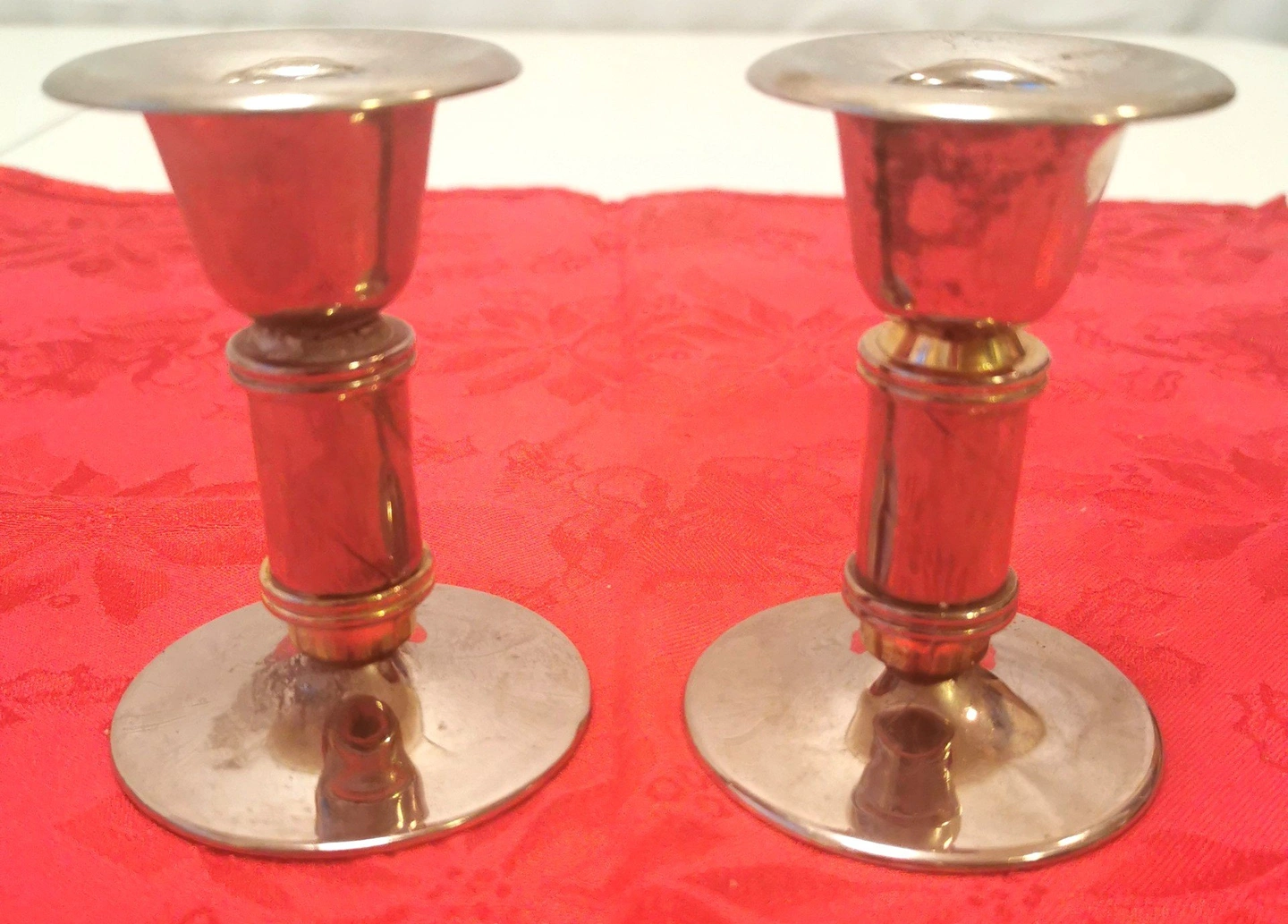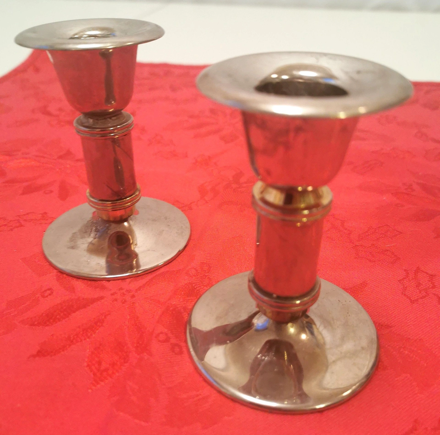 These unique candle stick holders are a pair of Vintage silver-plated pieces with a 1970s style. They have a bright finish silver plated. The set includes 2 candle holders designed in a compact size. Dimensions- Height 3.25 inches, Diameter 2.75 inches at base Condition: Good vintage condition some light wear please reference photos as part of the description.