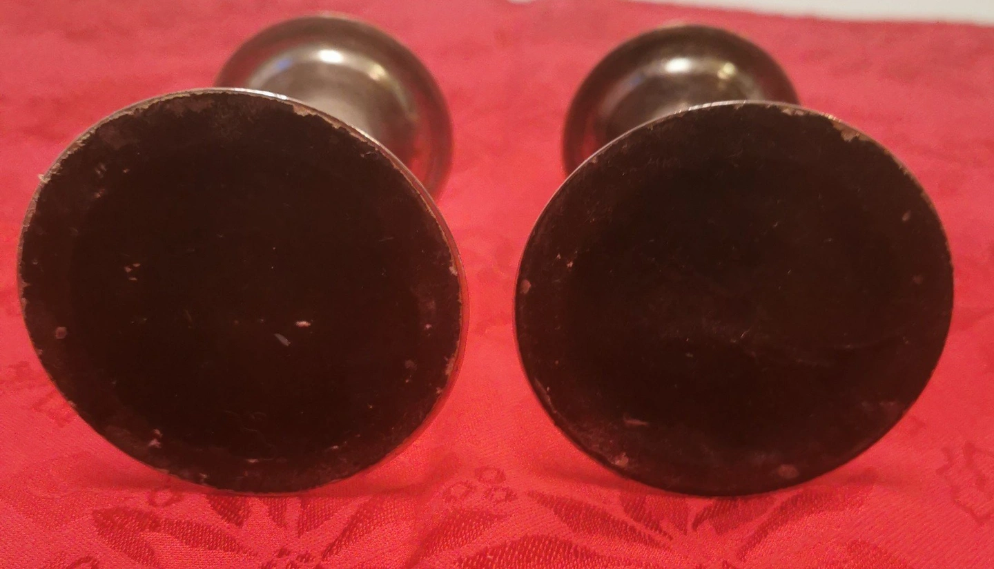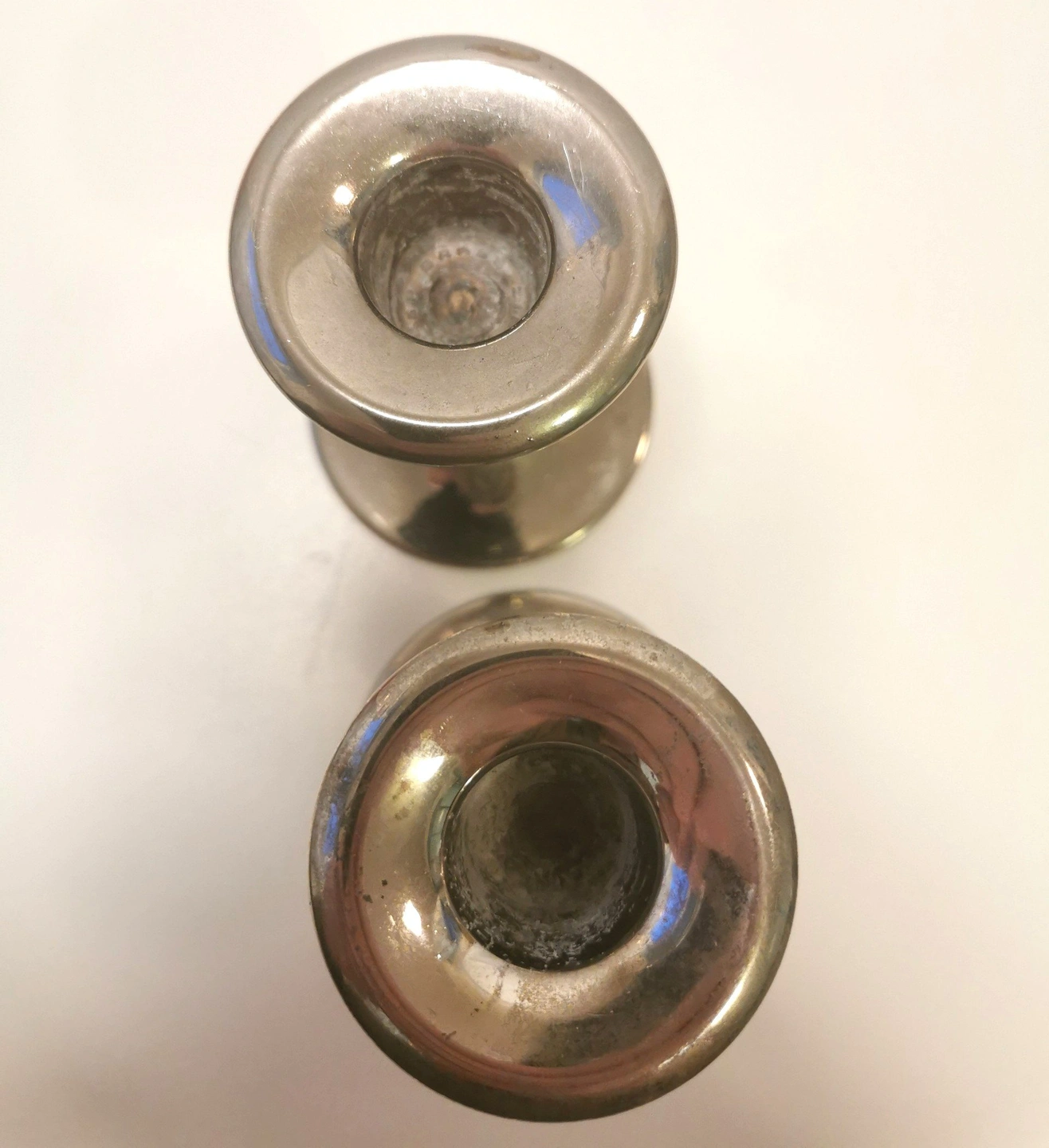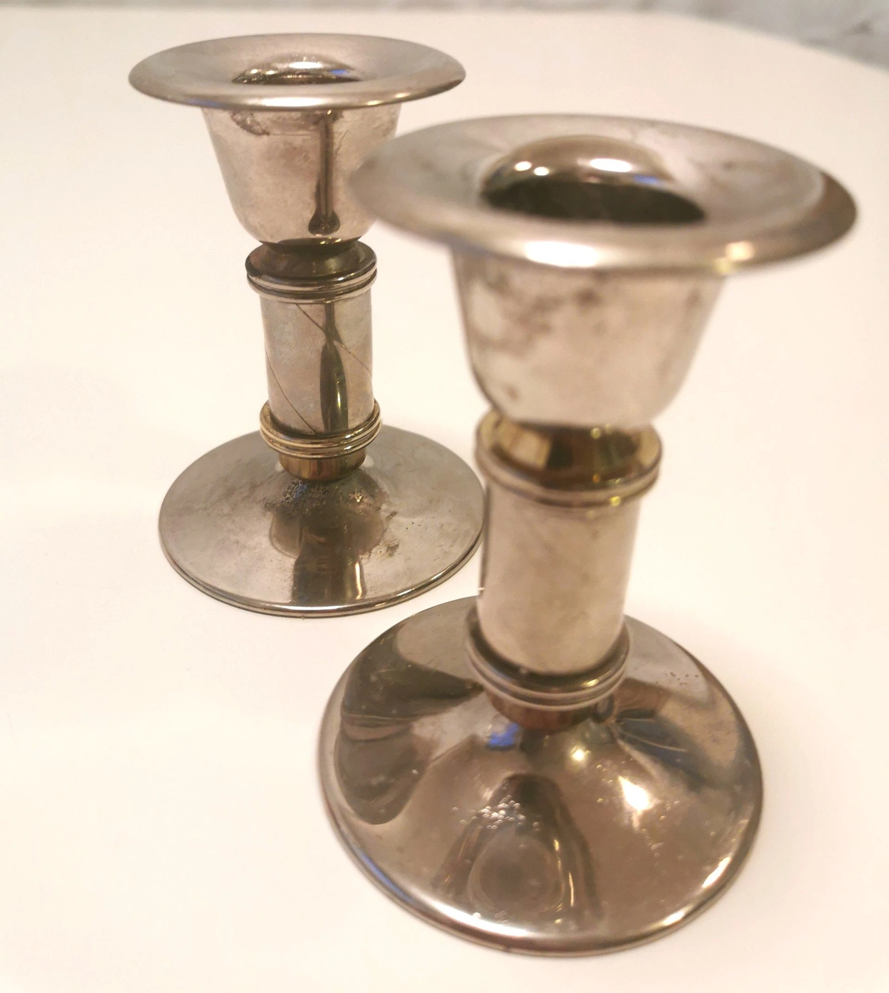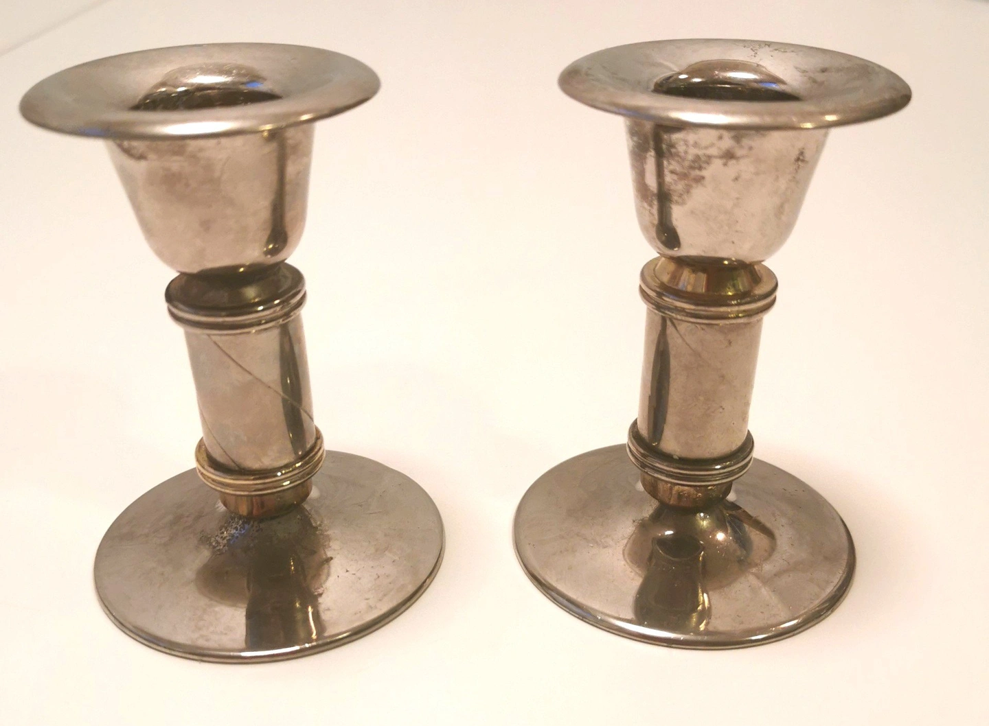 These unique candle stick holders are a pair of Vintage silver-plated pieces with a 1970s style. They have a bright finish silver plated. The set includes 2 candle holders designed in a compact size. Dimensions- Height 3.25 inches, Diameter 2.75 inches at base Condition: Good vintage condition some light wear please reference photos as part of the description.