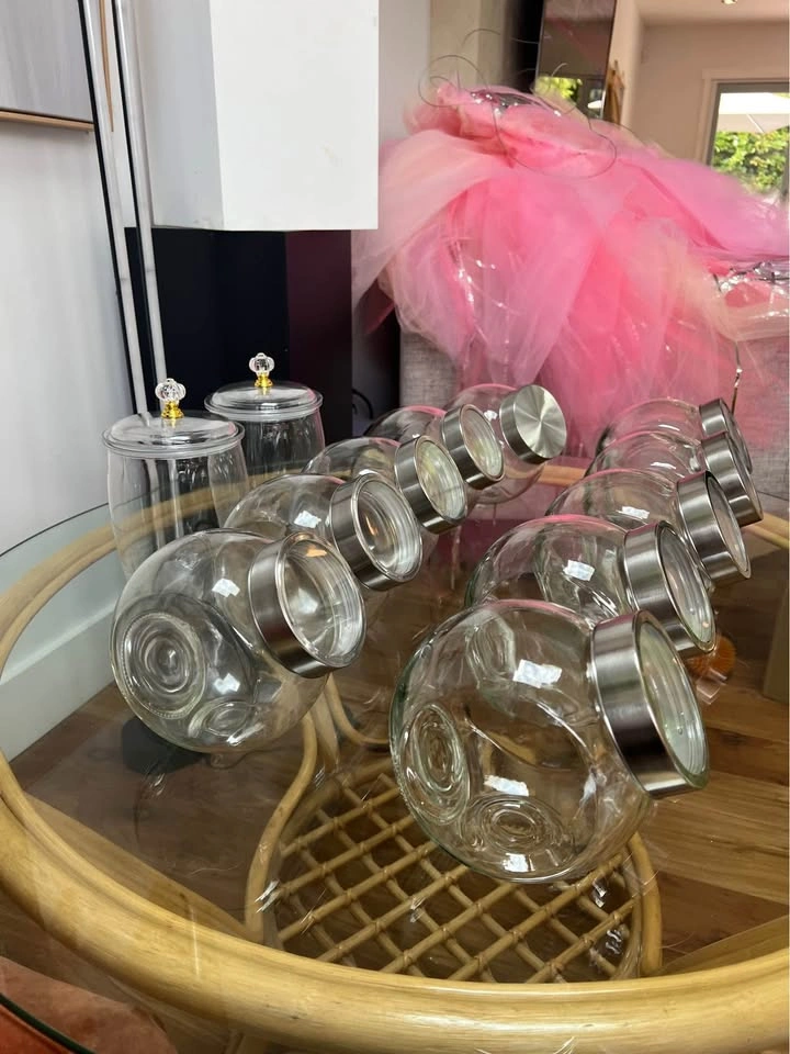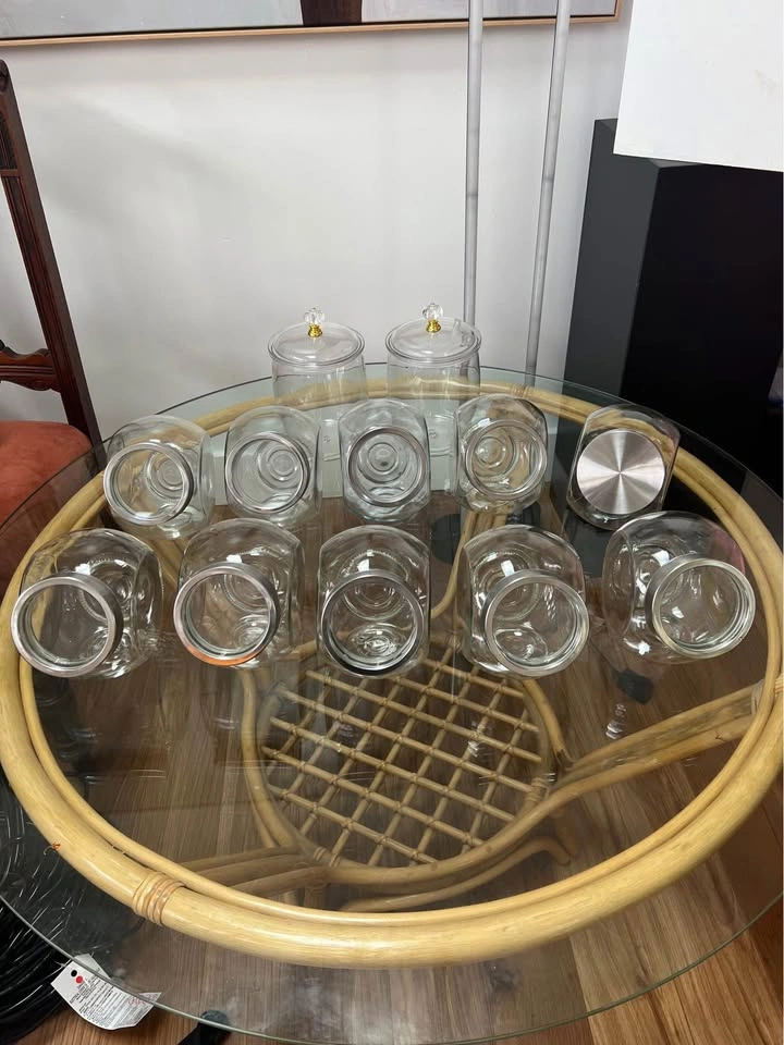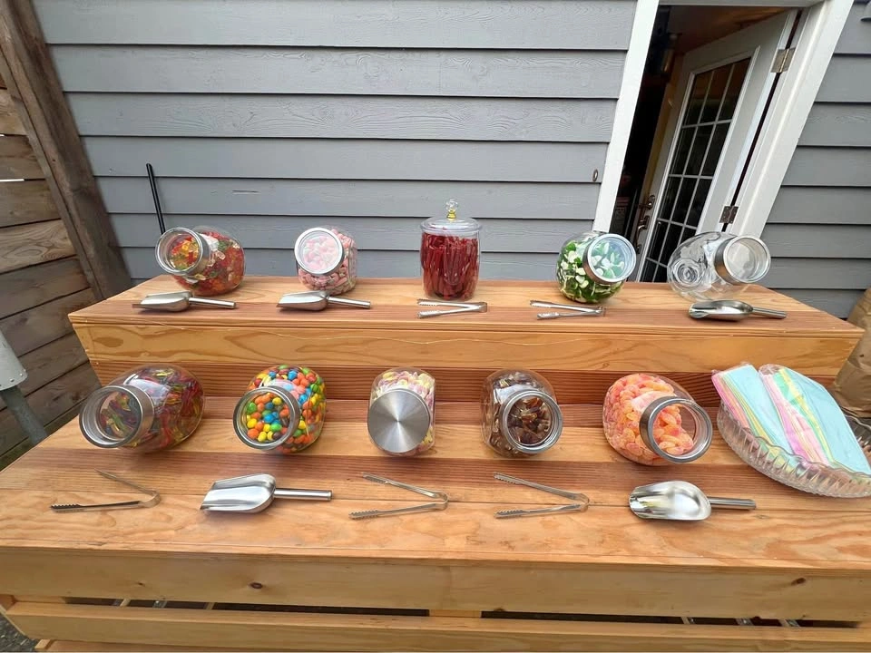 10 glass candy jars + 2 tall plastic jars. Scoops and tongs included. Wood bar and bowl not included. Pick up Tsawwassen. Cash only please