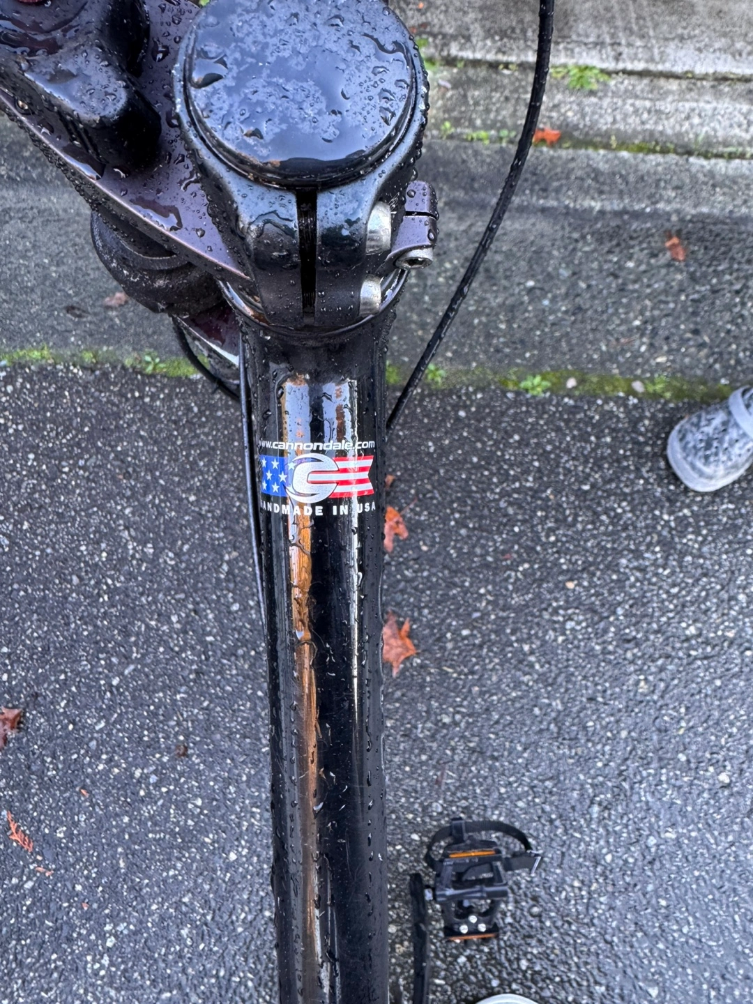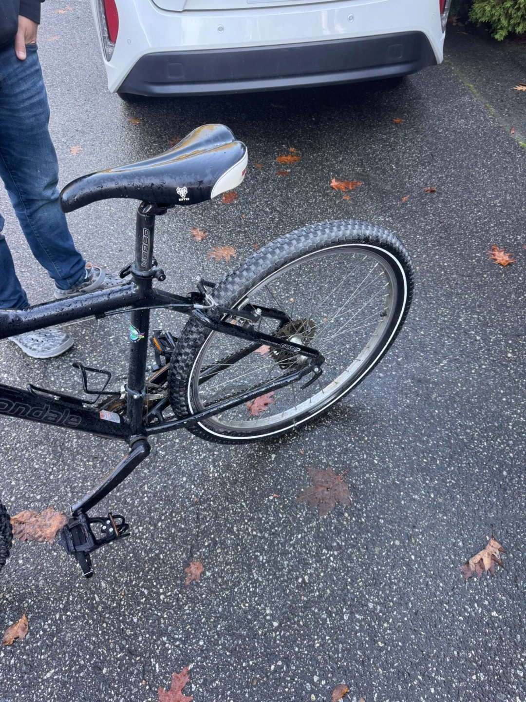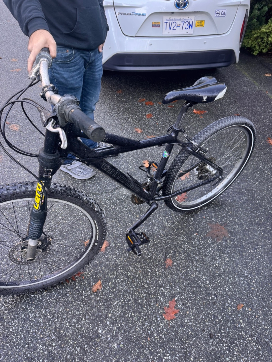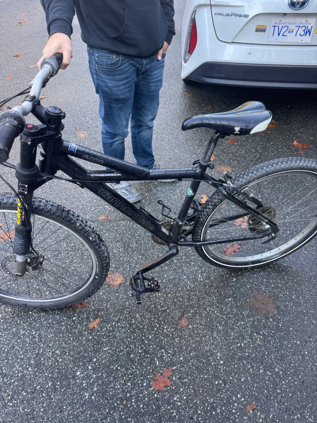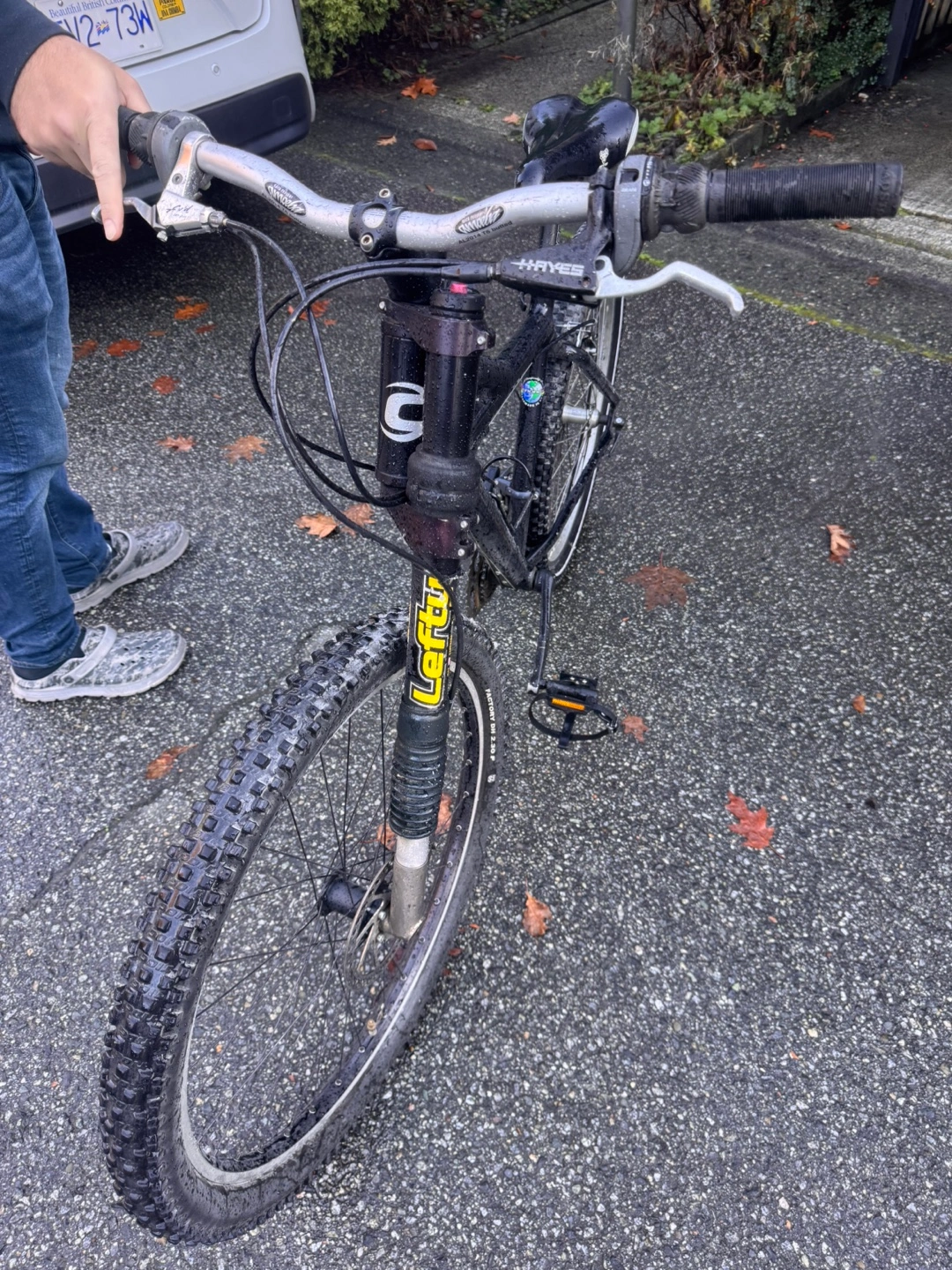 10Black mountain bike with front suspension and disc brakes. It has a black seat and pedals, water bottle cage, tuned up, new brakes, shoe holders, new helmet. My mom came to visit during the summer and bought it to bike around the city with my dad. Downsizing houses so I don’t have space to store it until she returns.