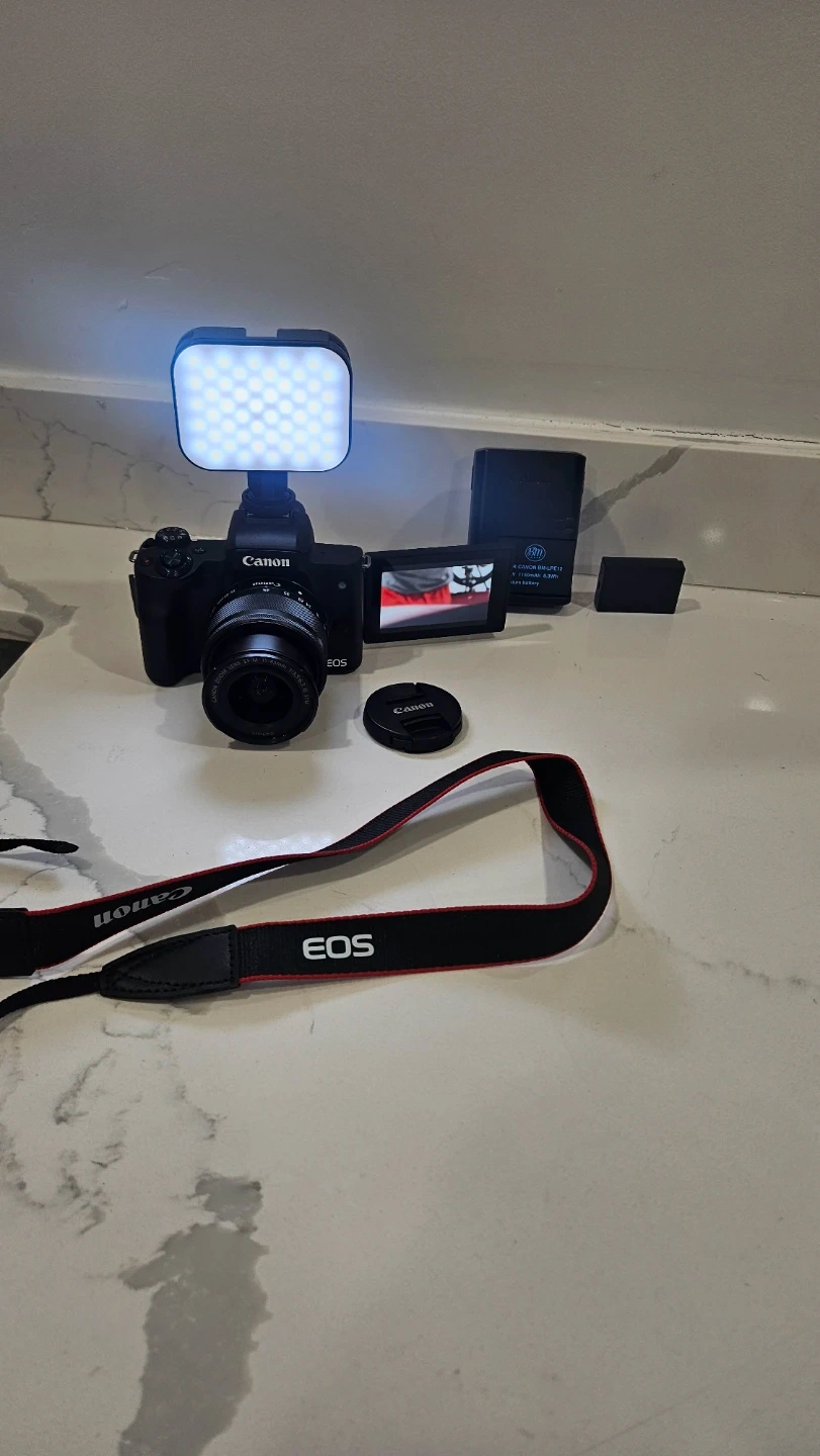 15Selling a Canon EOS M50 camera in great condition! Comes with a VILTROX VL-162T LED light, a Canon zoom lens EF-M 15-45mm 1:3.5-6.3 IS STM lens, a battery, and a Canon lens cap. Perfect for anyone looking to get into photography or upgrade their current setup!