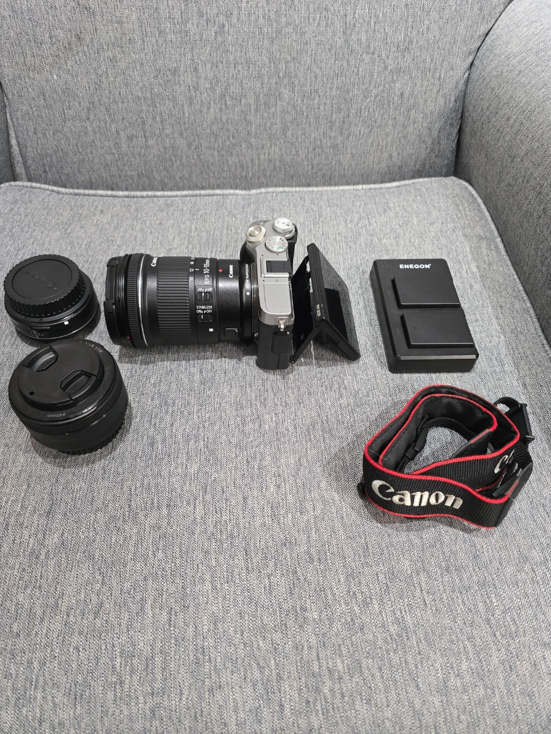 15Selling a Canon EOS M6 camera body with a few lenses and accessories. Included are the camera body, two lenses with lens caps, a battery charger, and a Canon camera strap. Great for photography enthusiasts!