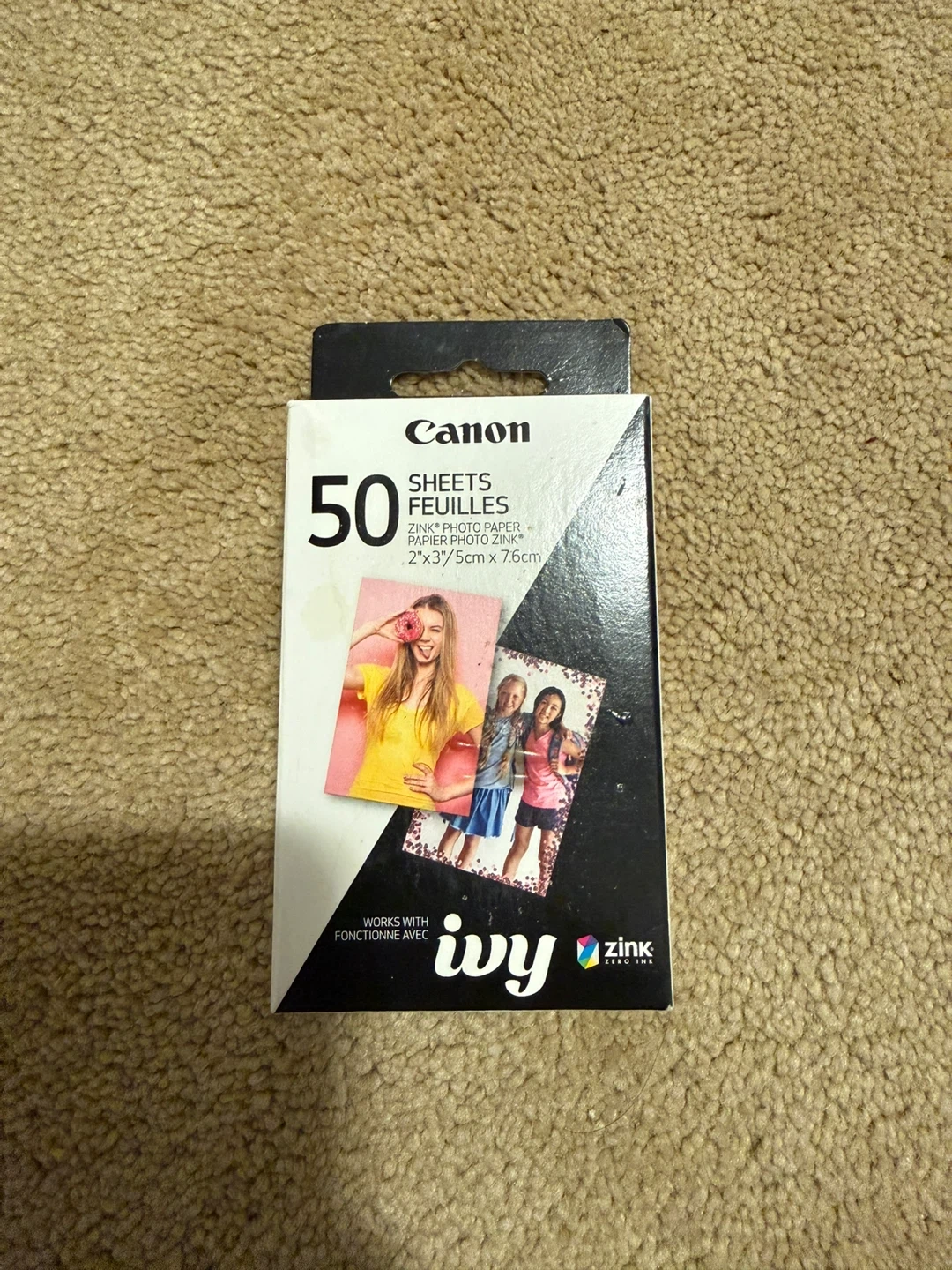 Selling a pack of Canon IVY ZINK photo paper! It contains 50 sheets of 2" x 3" / 5cm x 7.6cm paper. Works with Canon IVY mini photo printers. Great for printing photos!