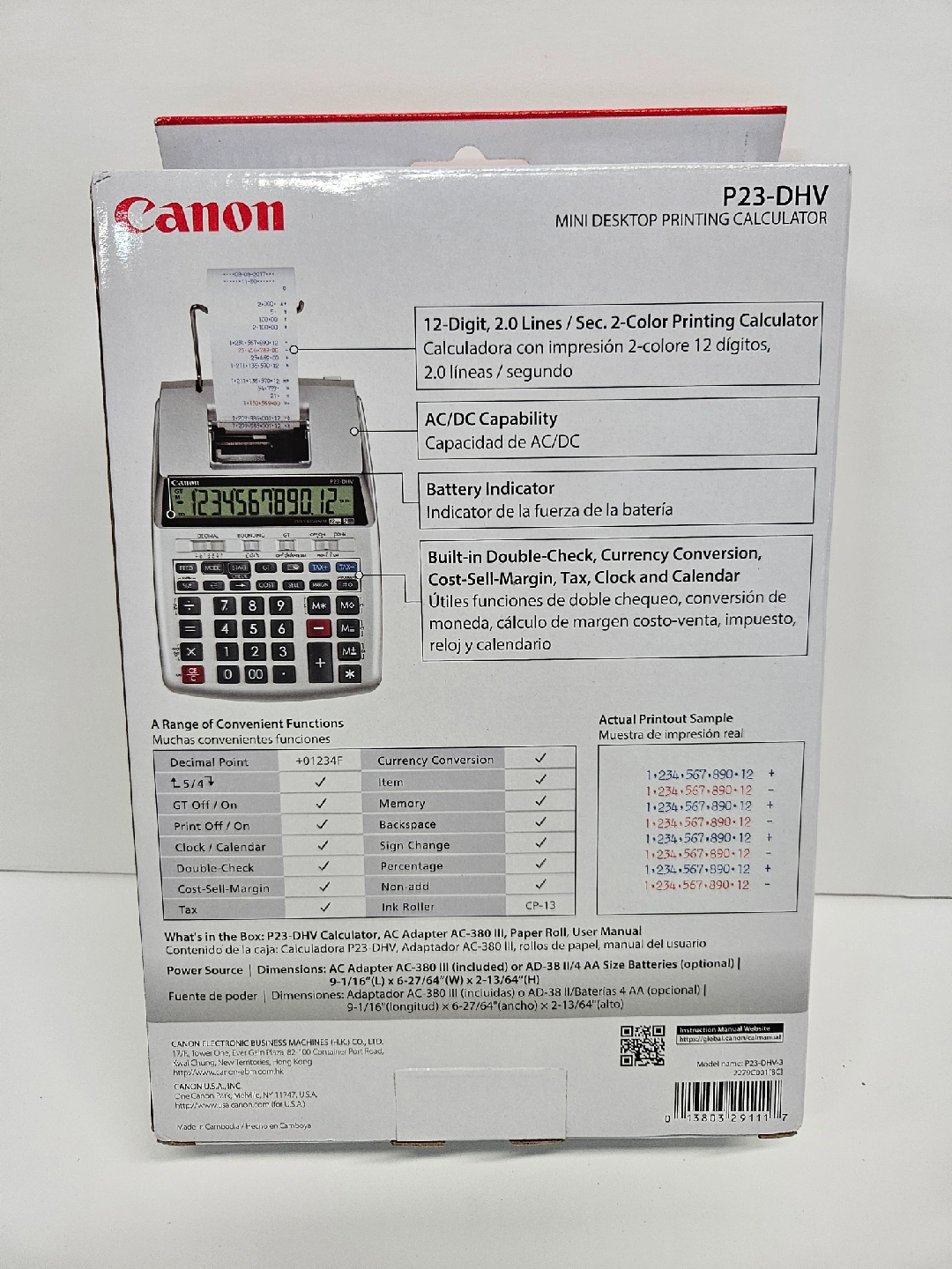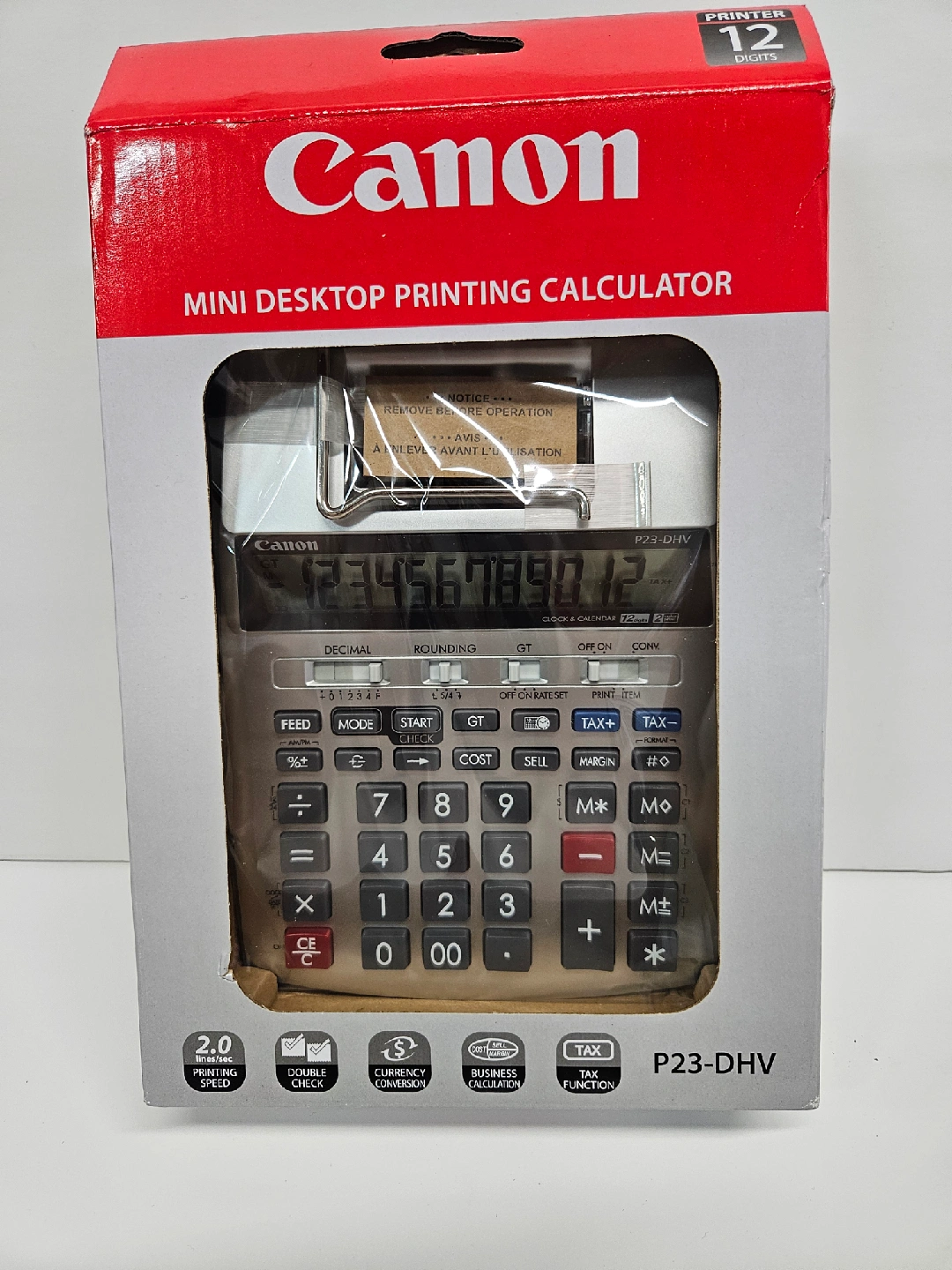 Selling a brand new Canon P23-DHV mini desktop printing calculator! It's still in its original box and ready to go. This calculator features: - 12-digit, 2.0 lines/sec, 2-color printing - AC/DC capability - Battery indicator - Built-in double-check, currency conversion, cost-sell-margin, tax, clock and calendar functions Great for home or office use!