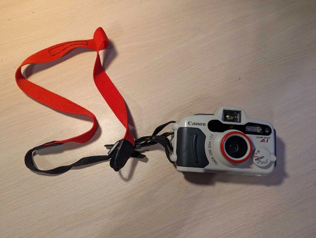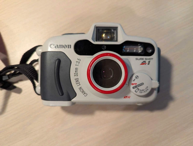 40Selling a used Canon Sure Shot A-1 35mm film camera, known for its reliable performance and point-and-shoot simplicity. This camera features a 32mm f/3.5 lens, auto-focus, and built-in flash, perfect for capturing memories with that classic film aesthetic. Specifications: * Lens: 32mm f/3.5 * Focus: Auto-focus * Flash: Built-in * Film Format: 35mm Does not include batteries or film Camera Bag is Free