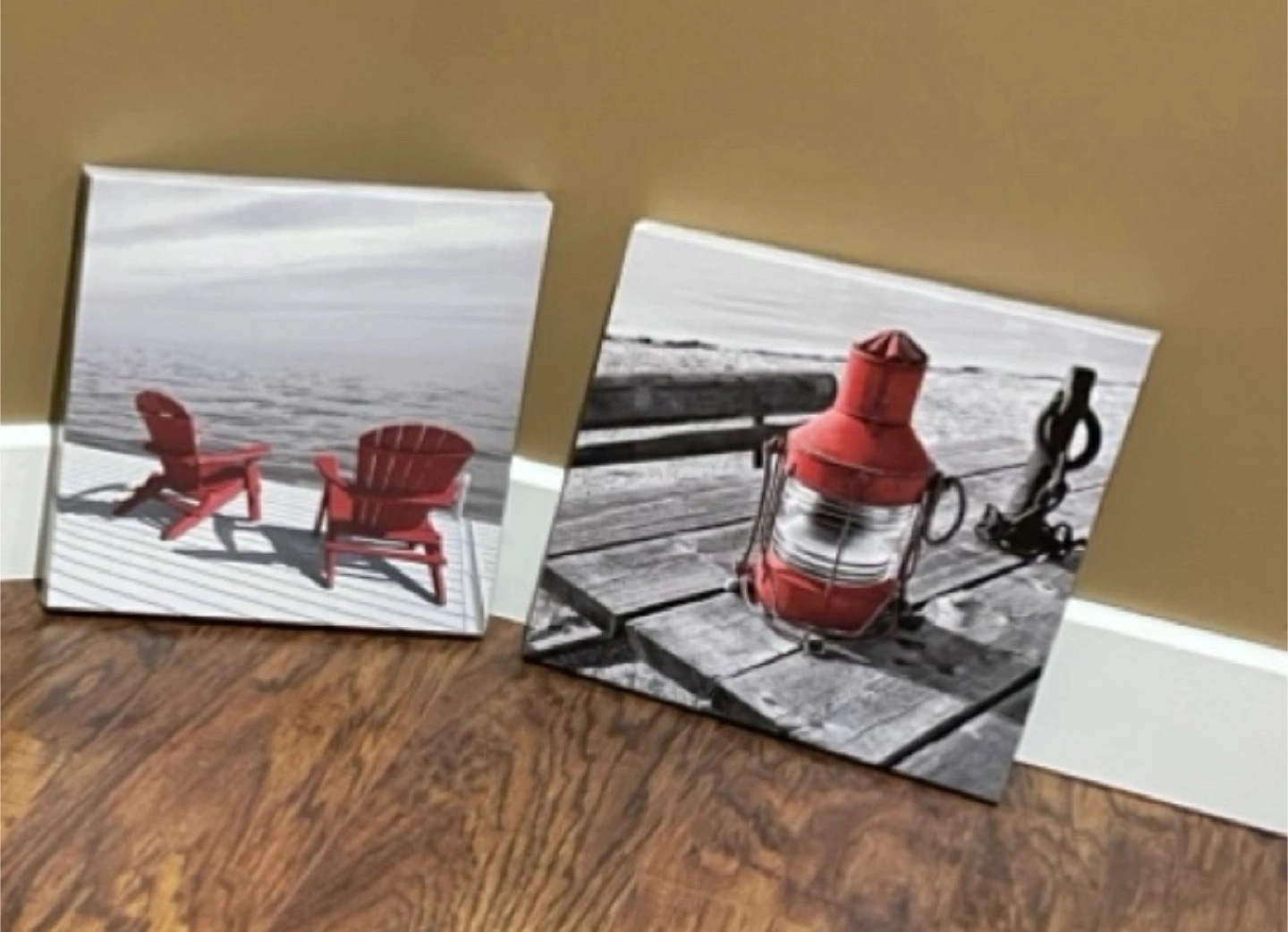 Two canvas prints for sale! One features red Adirondack chairs on a dock, and the other has a red lantern and anchor on a dock. They'd be a great addition to any room $10 ea