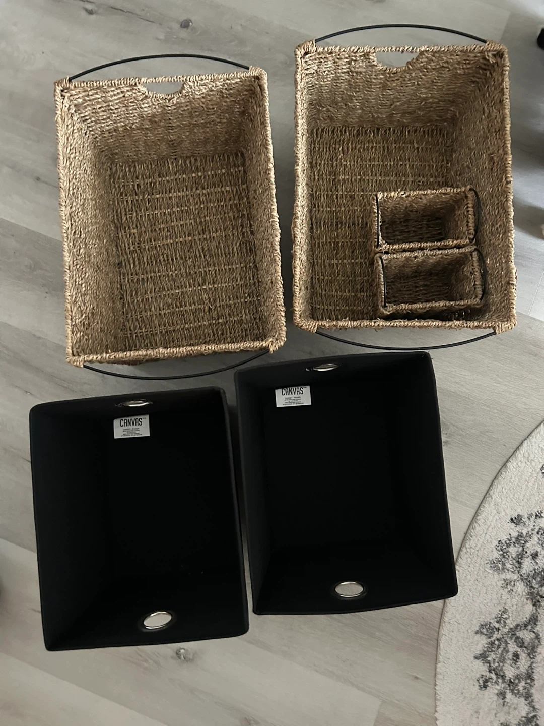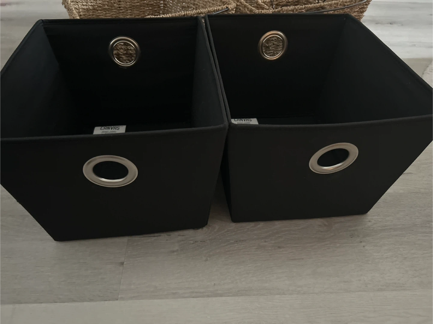 249Selling a set of four storage baskets! Two are made of a woven material and two are black fabric with metal grommets. They're in good condition and ready for a new home