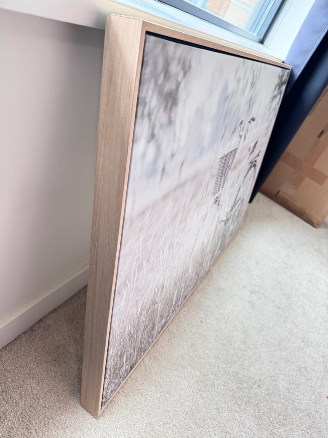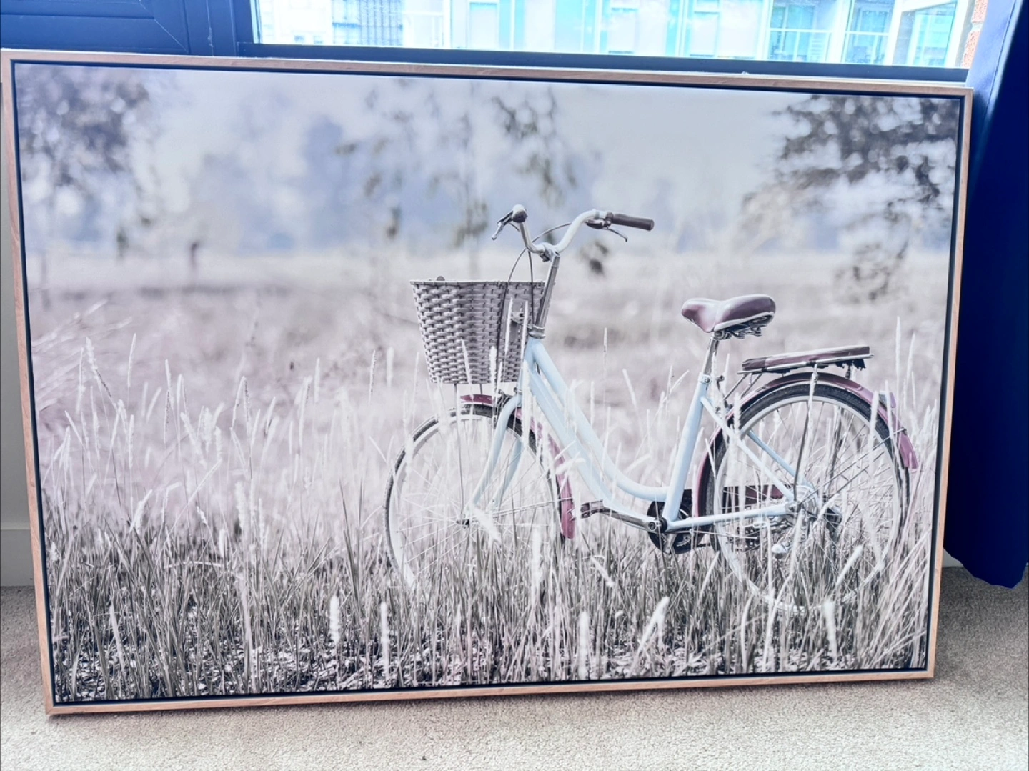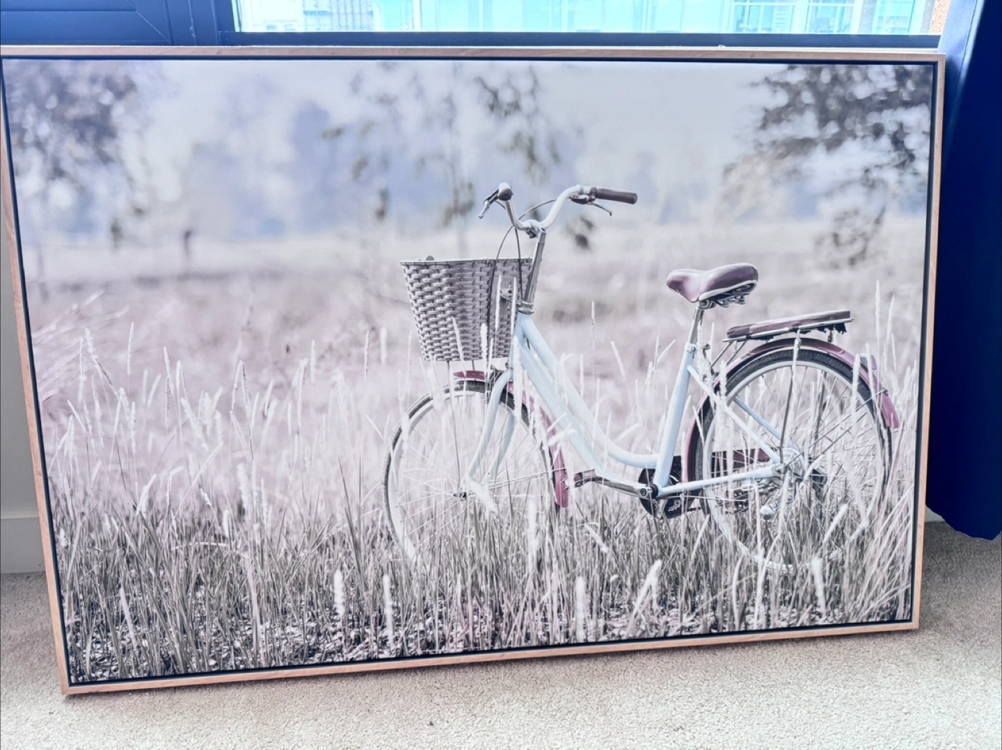 49Large canvas print. Features a vintage bicycle in a field of tall grass. Light colour palette. Wooden frame. Beautiful addition to any room. Wall painting from home sense. New Selling due to move
