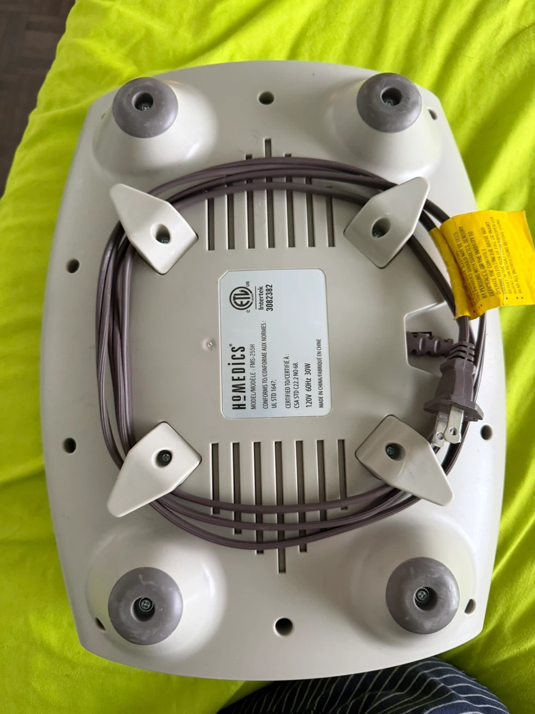 This HoMedics shiatsu massage cushion offers soothing kneading action for relaxation. It has a flexible design to target different areas and features a simple power button. This unit is 120V, 60Hz, 20W.