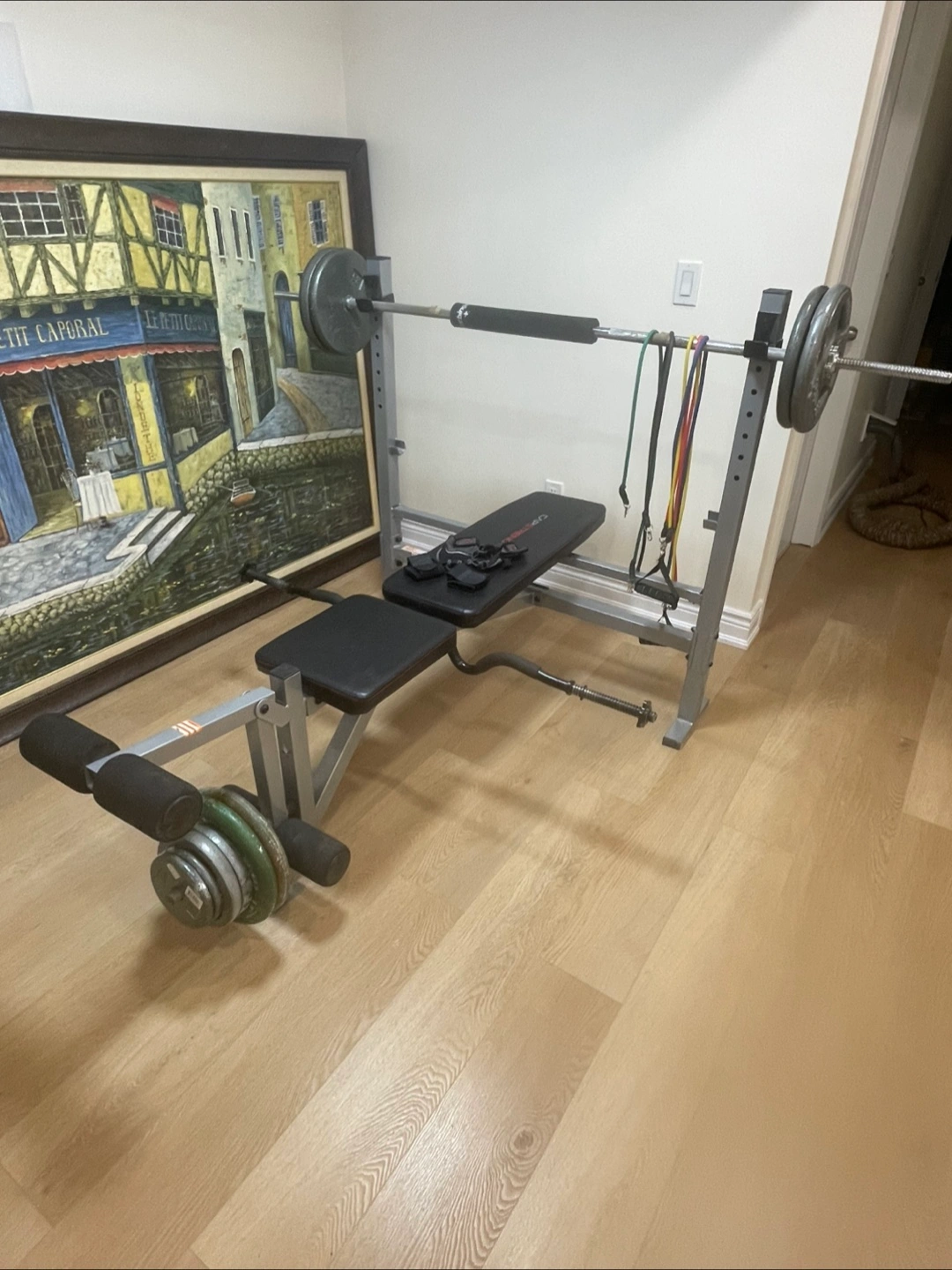 Selling a CAP Strength weight bench with preacher curl leg developer, includes bench press bar, curling bar, 180lbs barbell set (6x25lbs, 2x 10lbs, 2x5lbs). It's in good condition and ready for your home gym! Perfect for various exercises and strength training