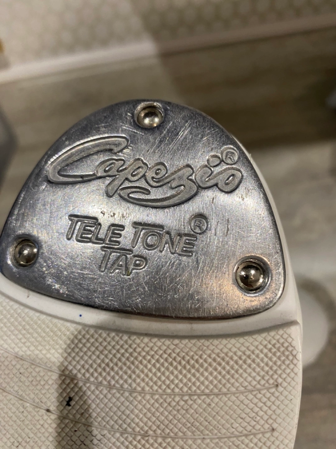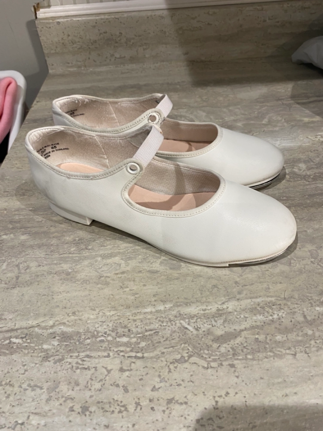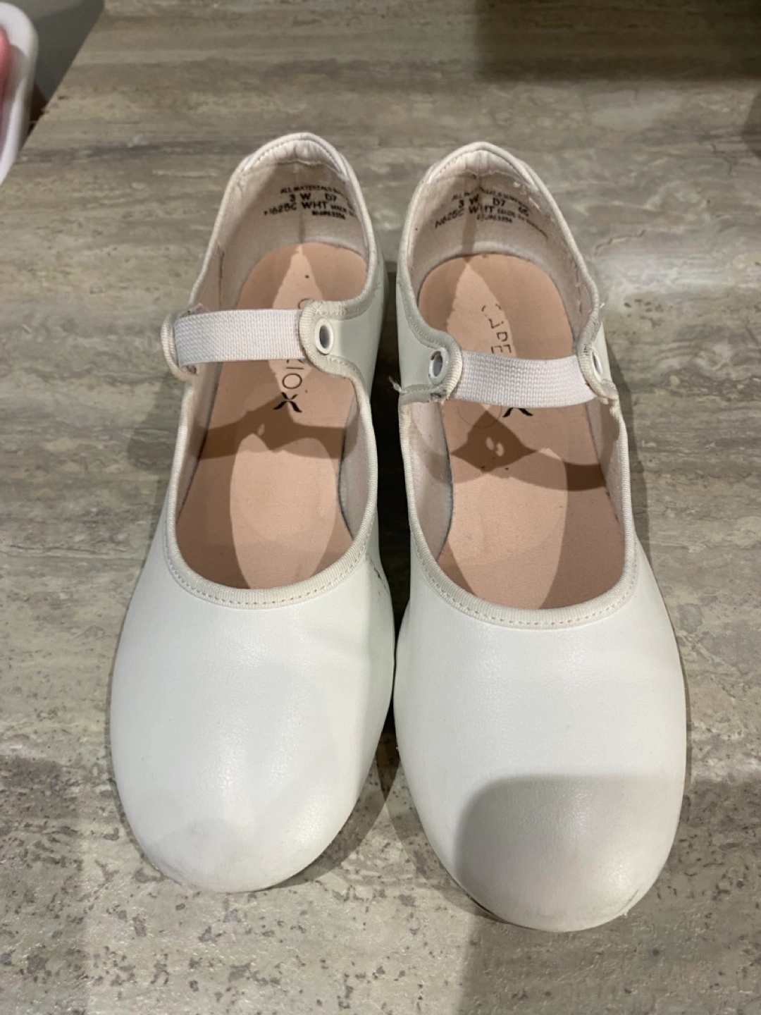 White leather Capezio tap shoes. Size 3W. Tele Tone tap. Good condition. Minor wear.