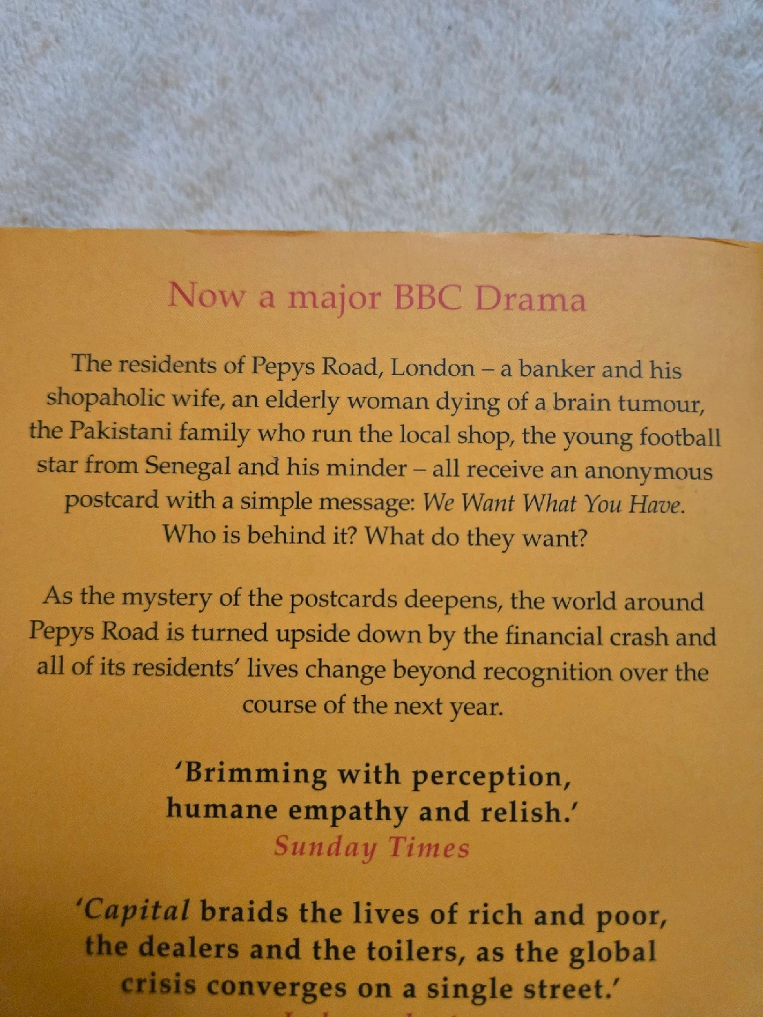 10Selling the book Capital by John Lanchester! It's a top ten bestseller and now a major BBC drama. The story follows the residents of Pepys Road in London and the changes in their lives over the course of a year. A great read!