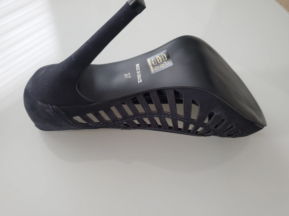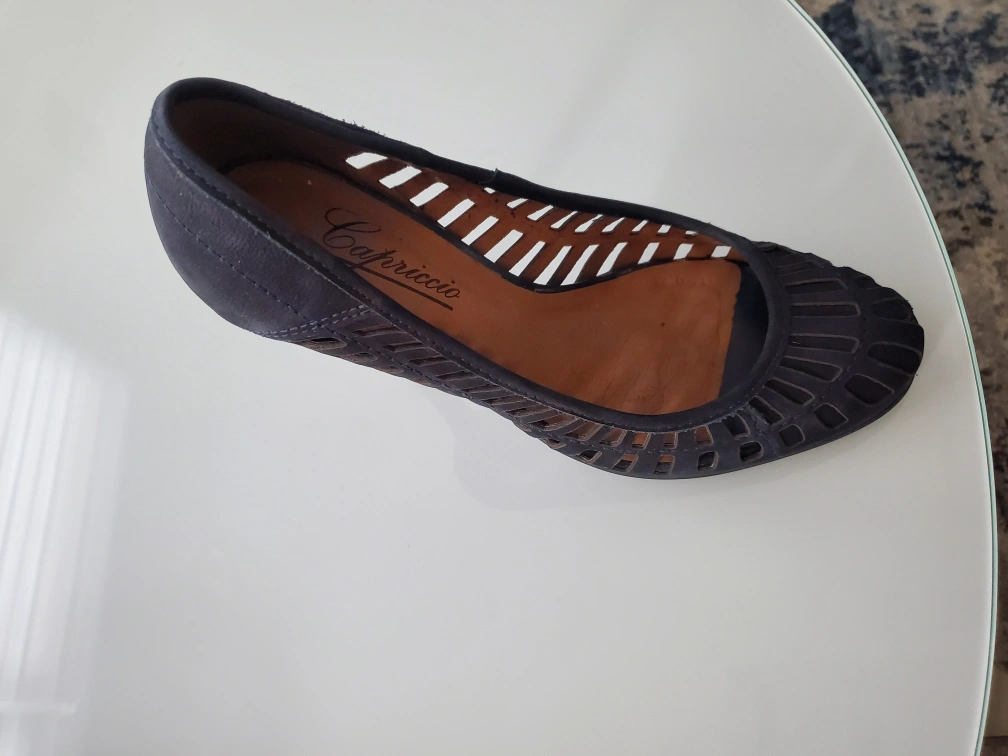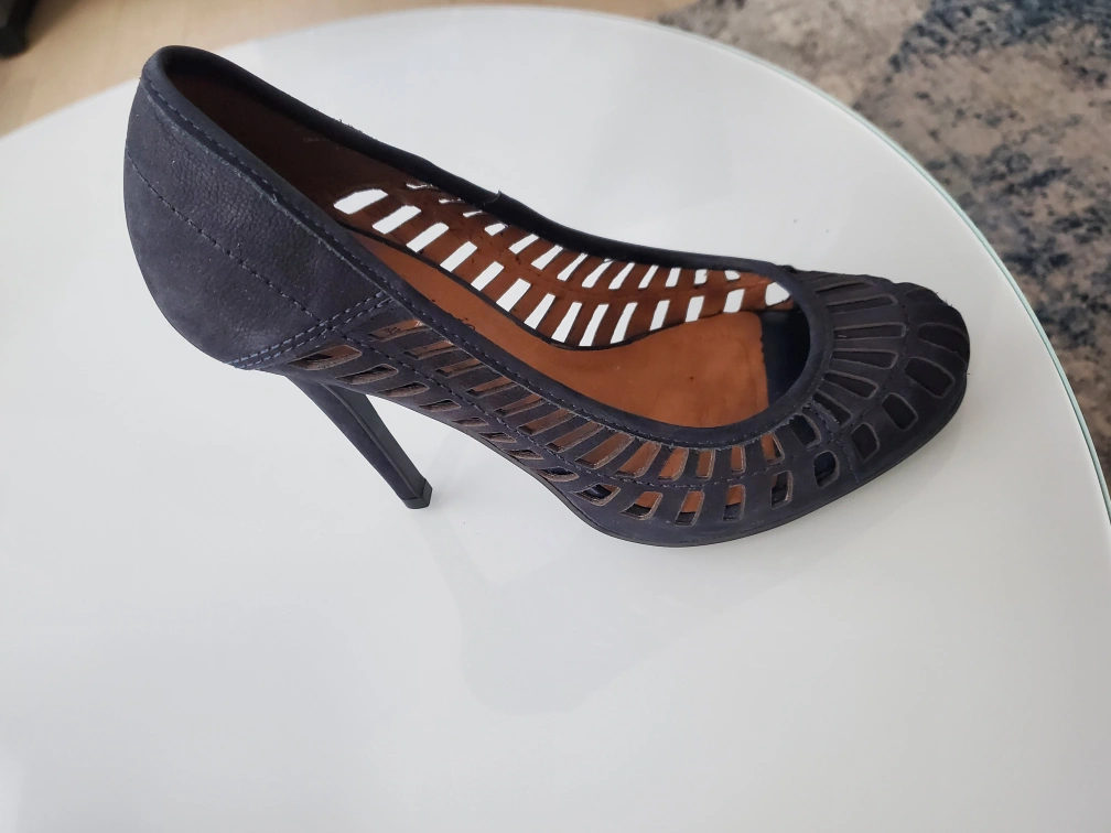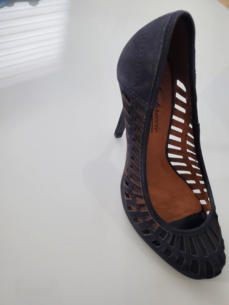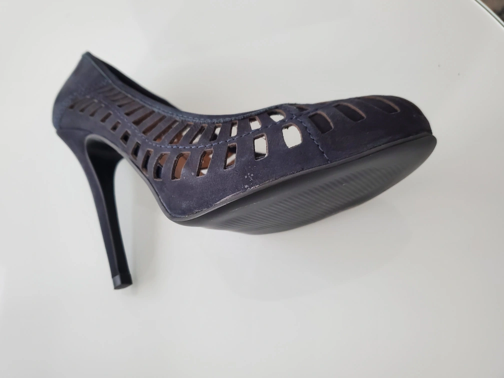 These Capriccio Navy blue suede heels are a stylish addition to any wardrobe! They are a size 37 (6.5) and feature a unique cut-out design. Perfect for a night out or a special occasion, 4.5" heel with 3/4" platform leather insole never worn.