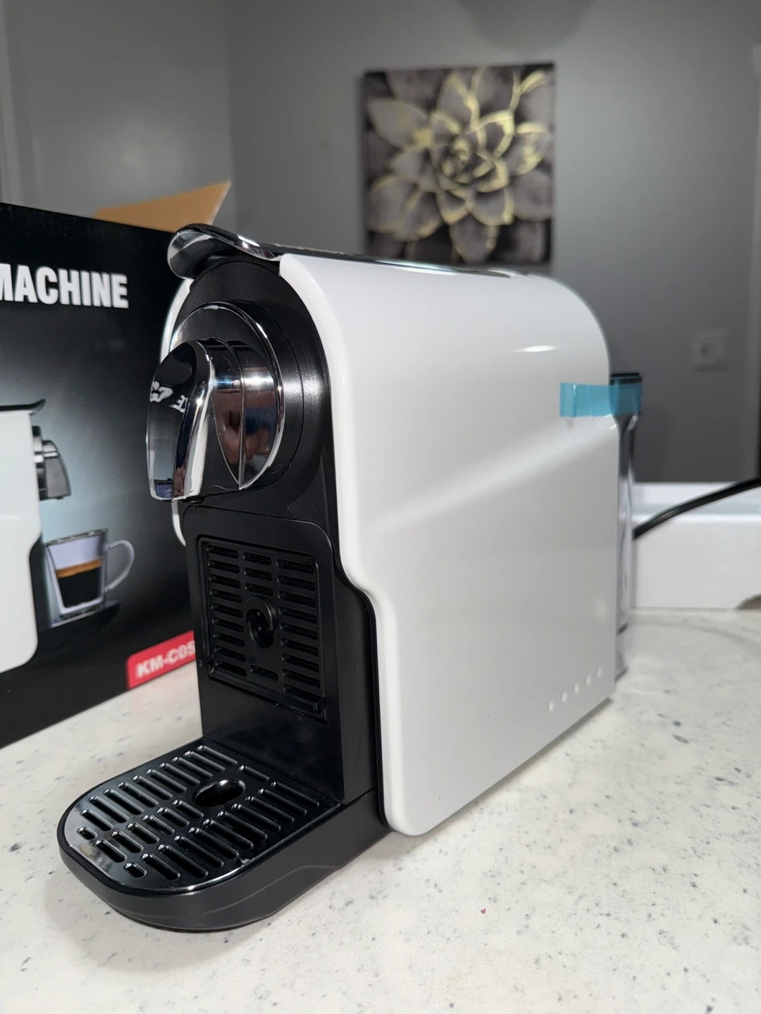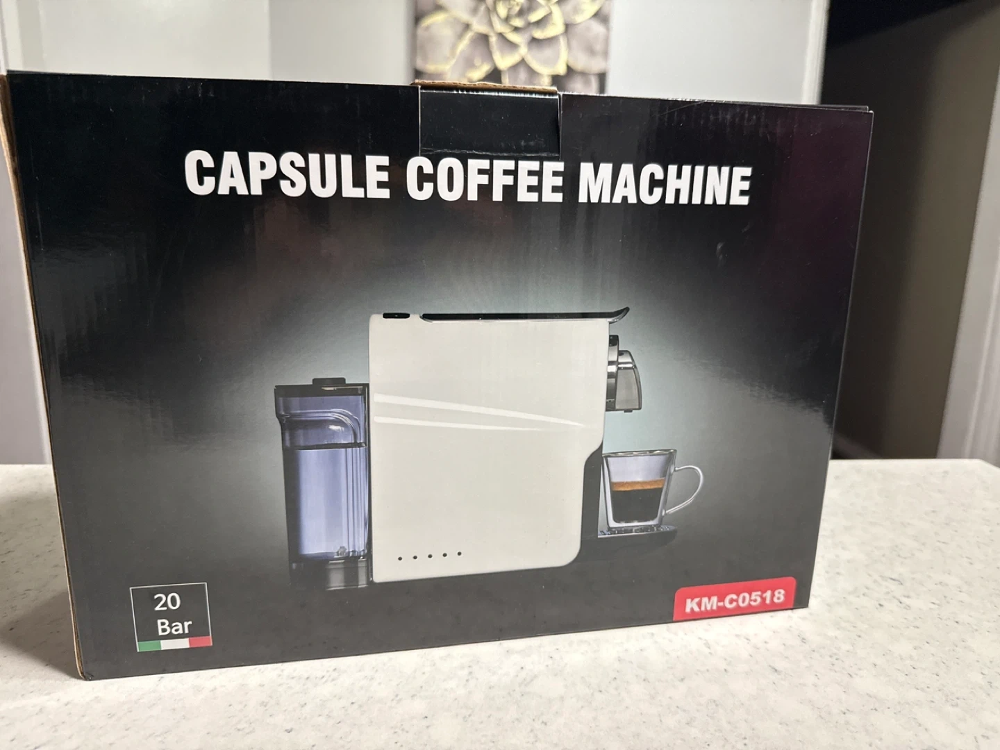 Selling a capsule coffee machine, model KM-C0518. It's in great condition and comes with the original box and instruction manual. This machine is compatible with Nespresso capsules and has a fast heat-up function. It also features automatic off mode after 30 minutes. Perfect for espresso and lungo lovers