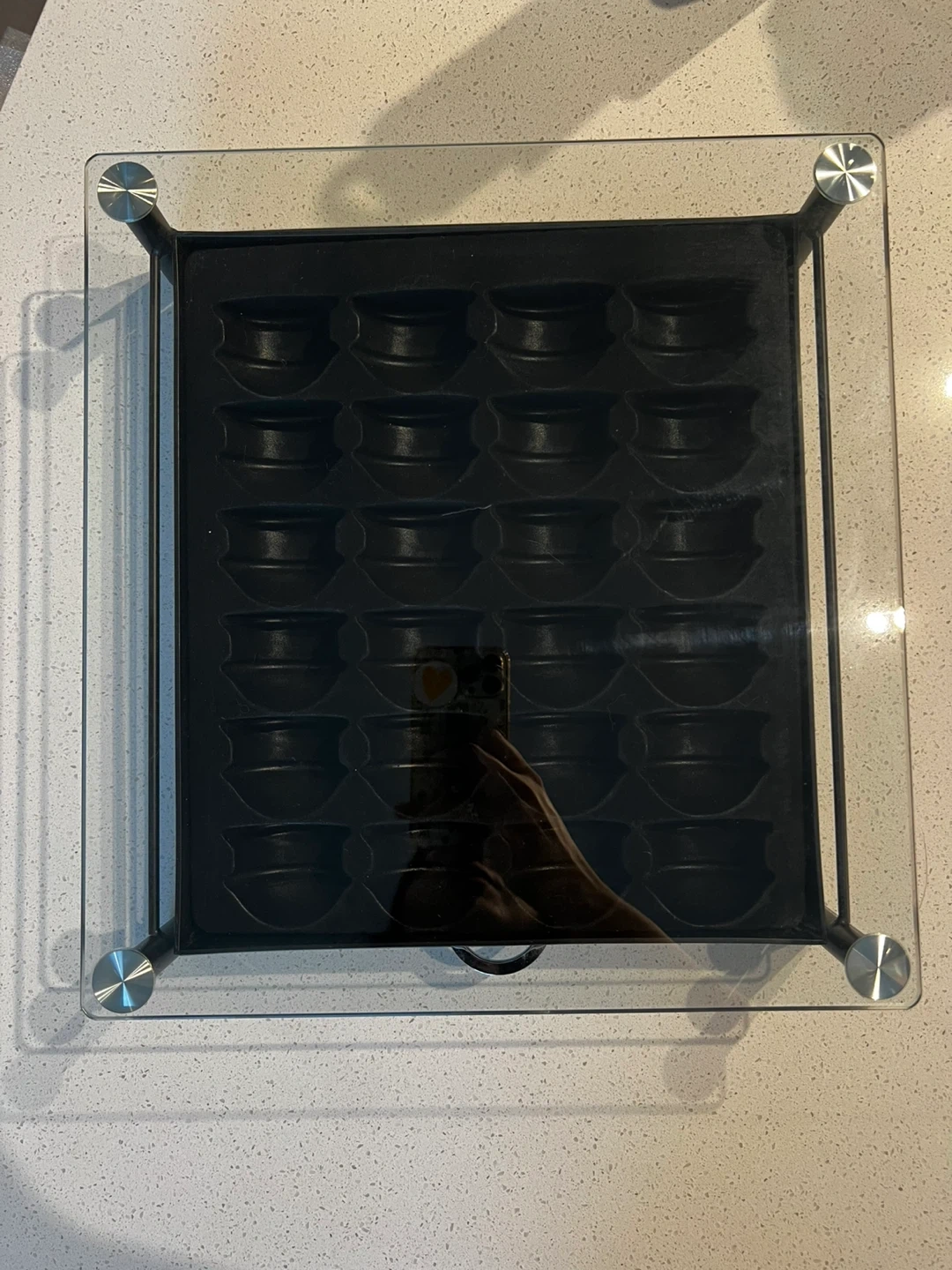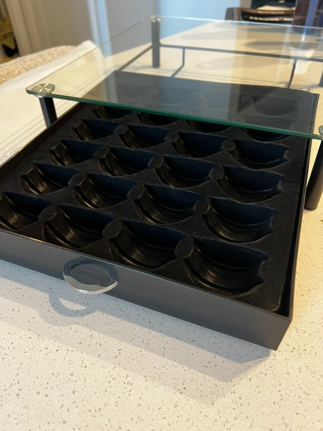 120Selling a capsule holder with a glass top and sliding drawer. Capacity for 24 large capsules or 48 small ones (Nespresso or similar). It is in excellent condition, like new, with no scratches or marks… perfect for keeping your capsules organized and stylish in the kitchen or office ☕️