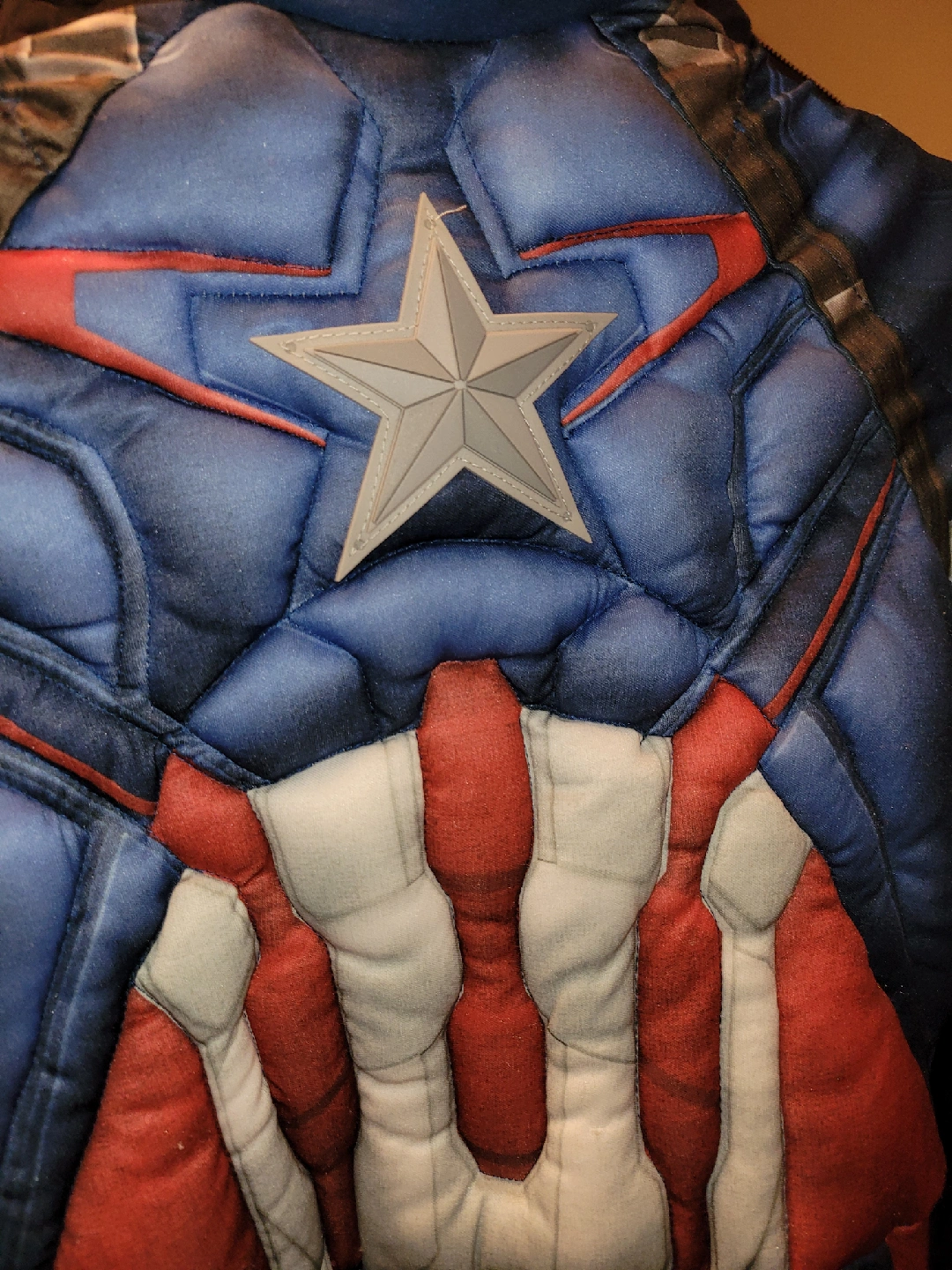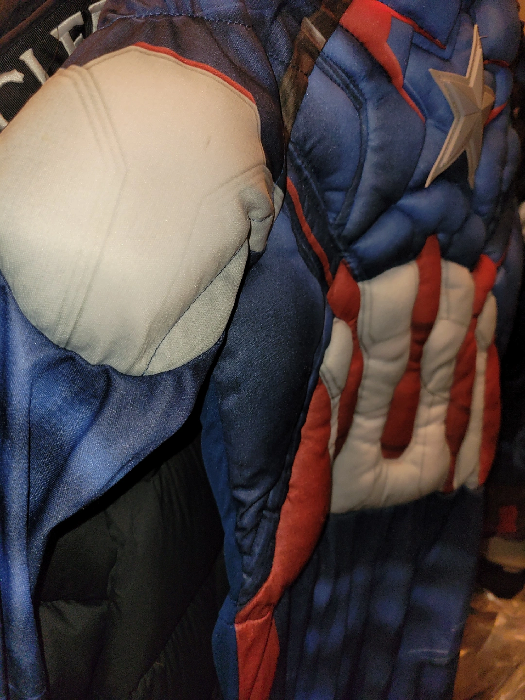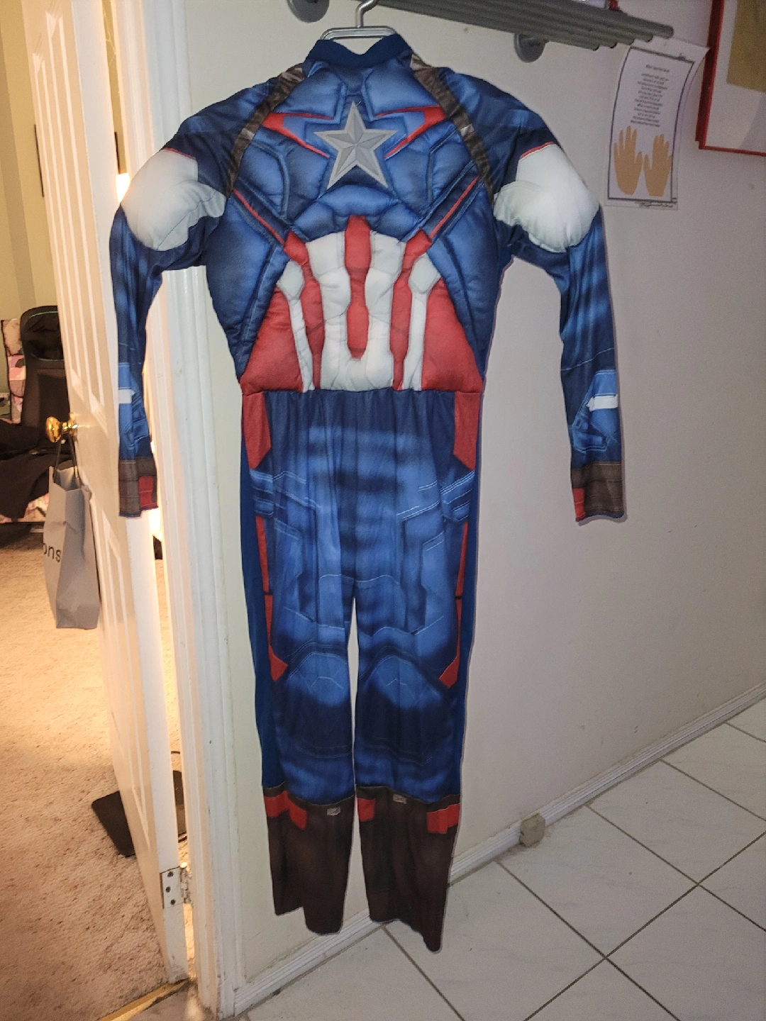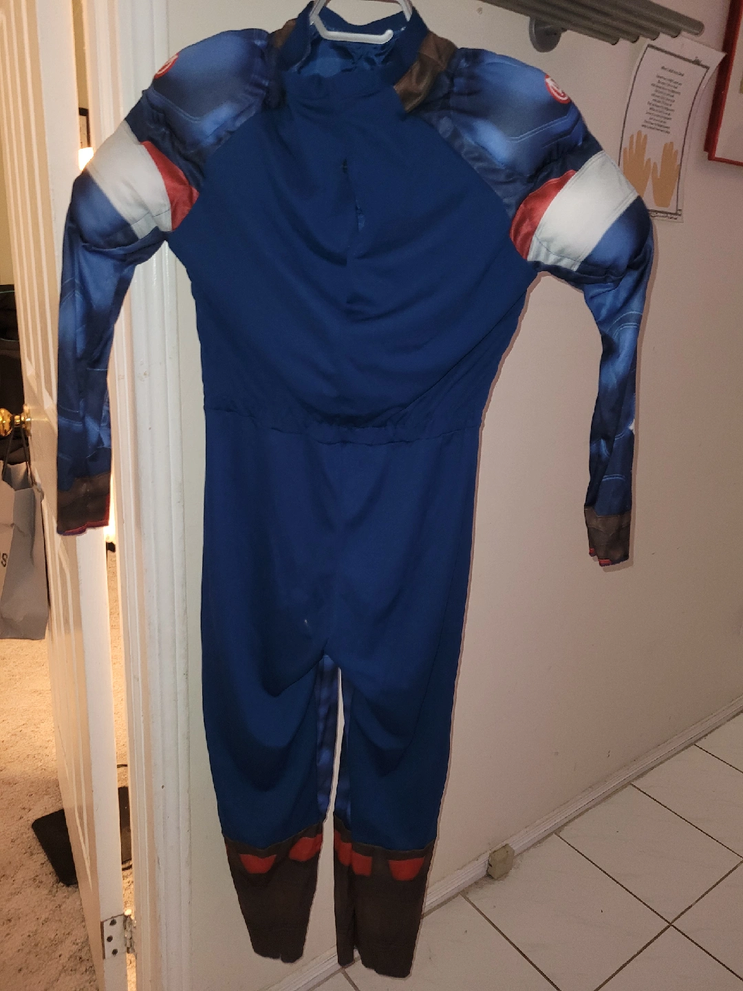 77Selling a Captain America costume! It's in great shape and ready for a new superhero in training. Has puffy shoulders and chest. Fits under 10 yrs old, pending on height and size.