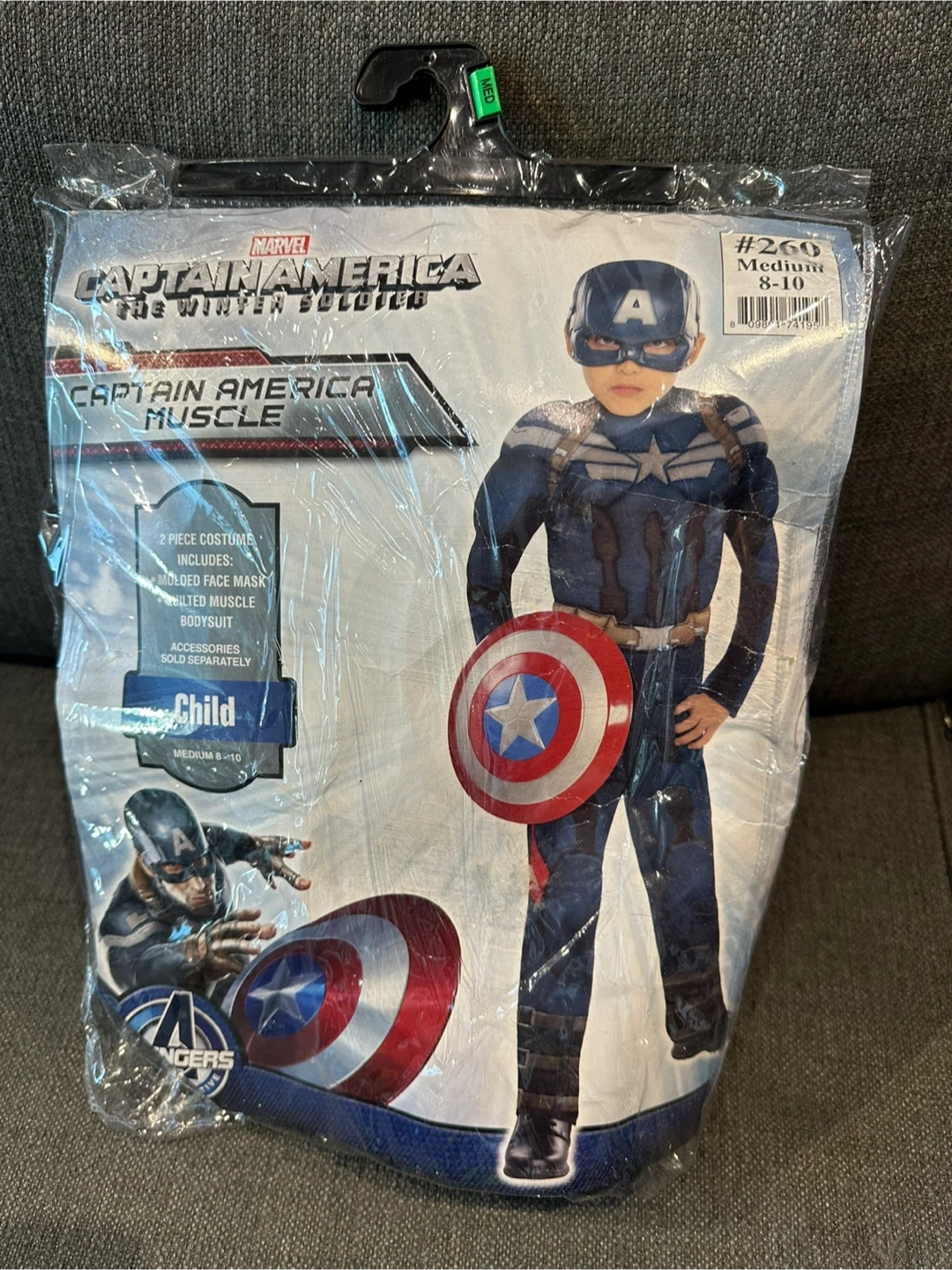 14Captain America Muscle costume in size medium (8-10). This 2-piece costume includes a face mask and a belted muscle bodysuit. Perfect for your little superhero! New in the package. Never worn. Full disclosure the face mask arrived with a small crack on the top.