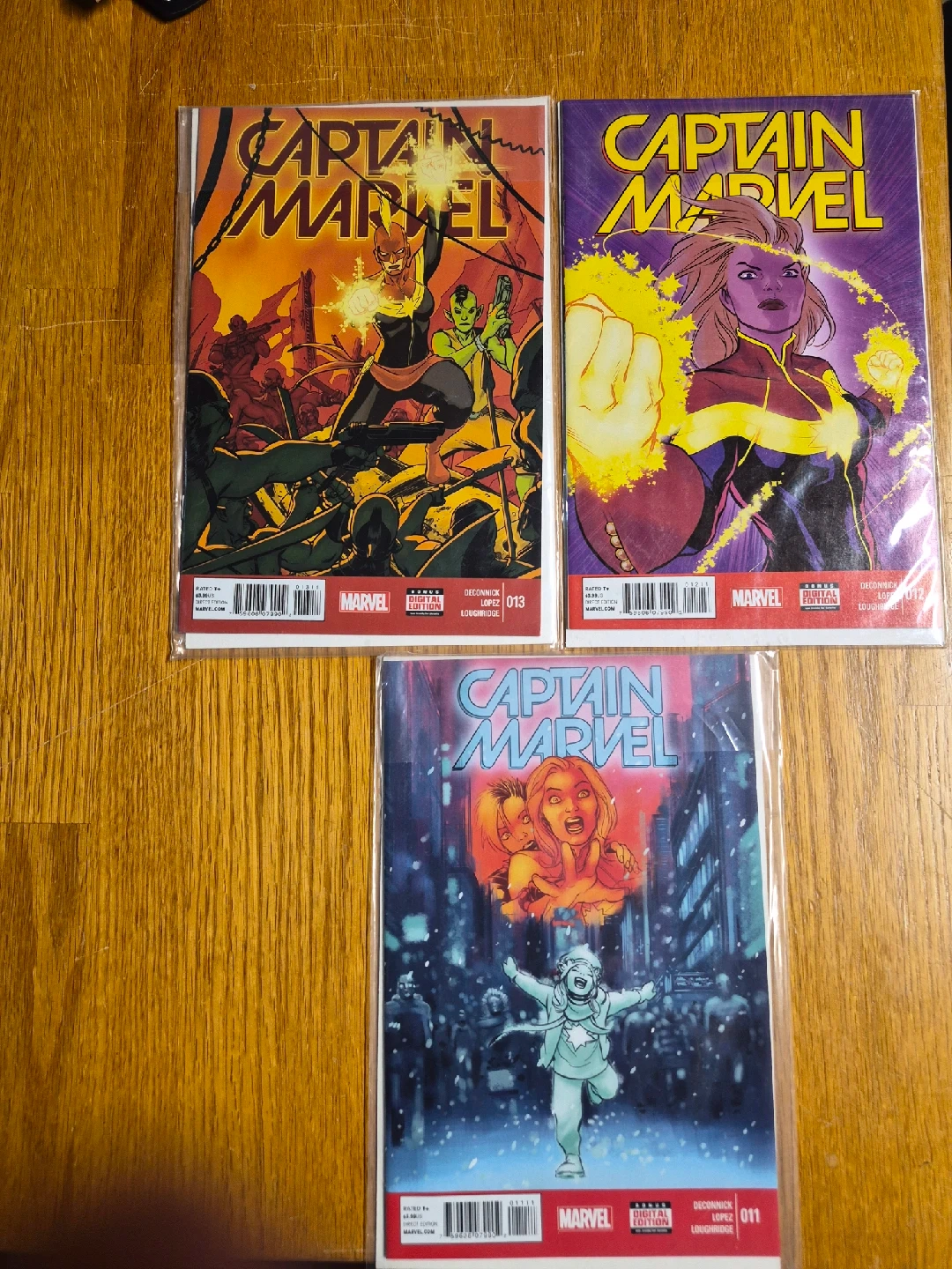 10Selling a set of Captain Marvel comic books! Includes issues 011, 012, and 013. Each comic comes with a digital edition as well. Great for any Marvel fan!