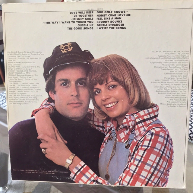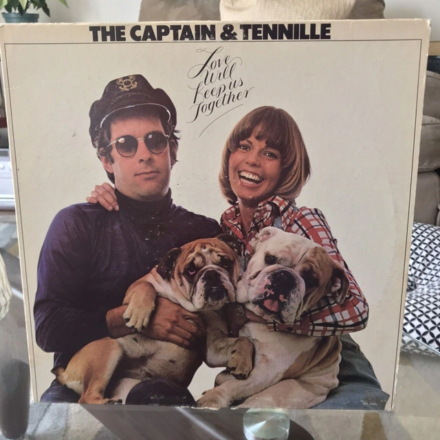 184Captain & Tennille ~ "Love Will Keep Us Together" Record Album Cover and Vinyl VG++. "Love Will Keep Us Together" is the first release by the duo Captain & Tennille. It was released in 1975 by A&M Records in both stereo (SP-4552) and CD-4 quadraphonic (QU-54552) versions. The album would peak at No. 2 on the Billboard 200 album chart, while the title song, "Love Will Keep Us Together", won the Grammy Award for Record Of The Year and was nominated for Song Of The Year. The cover of the album features a photo of Toni Tennille and Daryl Dragon sitting with two of their bulldogs. Niagara Falls pick-up