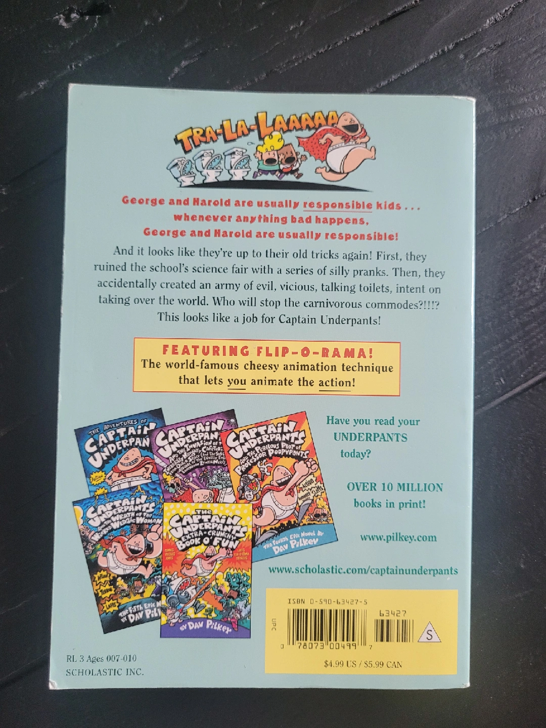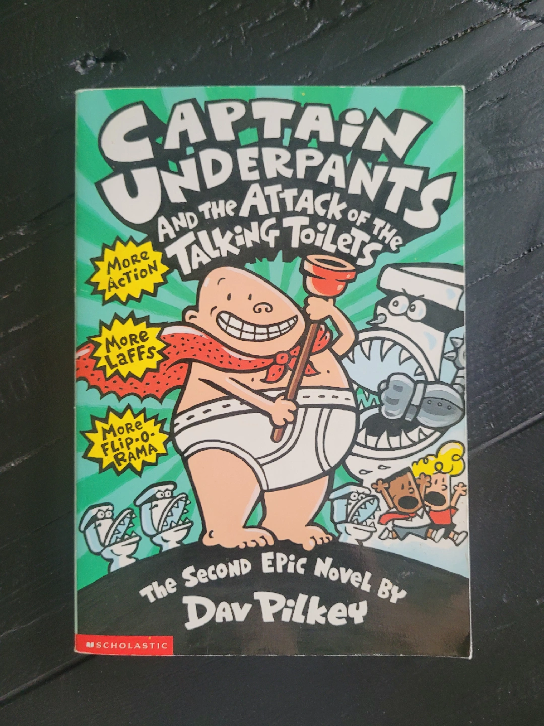 Selling the book, Captain Underpants and the Attack of the Talking Toilets by Dav Pilkey! It's the second epic novel in the series. Great for young readers!