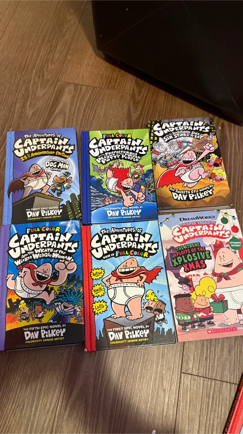 93Selling a collection of Captain Underpants books by Dav Pilkey! Each 5$, all for 25 They're in great shape and ready for a new home. Perfect for young readers who love a good laugh and some silly adventures. Includes: - The Adventures of Captain Underpants 25th Anniversary Edition - Captain Underpants and the Preposterous Plight of the Potty People - Captain Underpants and the Sensational Saga of Sir Stinks-a-Lot - Captain Underpants and the Wrath of the Wicked Wedgie Woman - The Adventures of Captain Underpants Now in Full Color