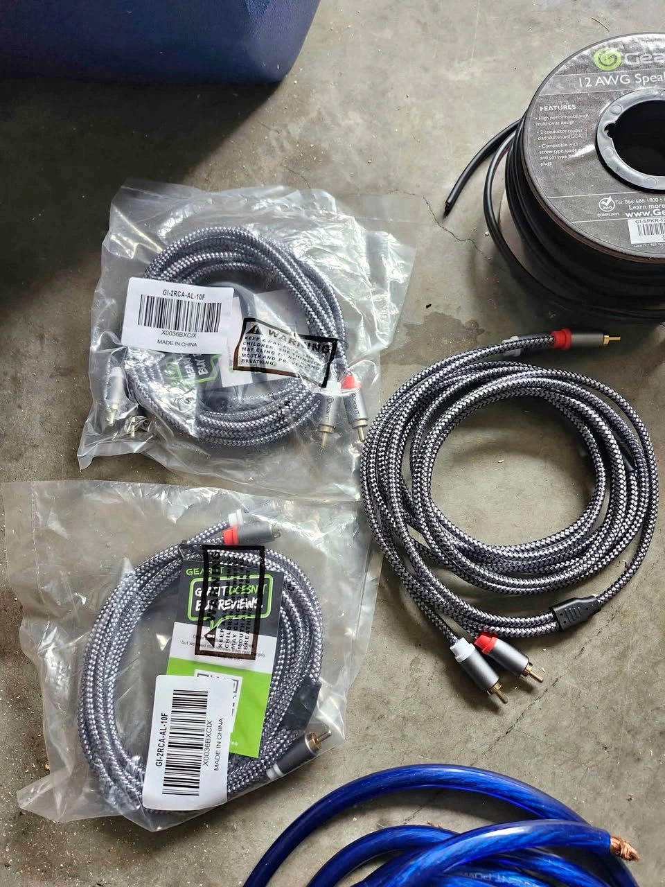 10Large box of car audio wiring and Monster cable splitters. 2 new rolls of speaker wiring, several new sets of rca cables, several fuse blocks, several feet of large power cable for amps. Both Monster cable splitters are gold plated and worked for my 1 gauge to 4 gauge feed for multiple amps. All in great or New shape, check photo for items.