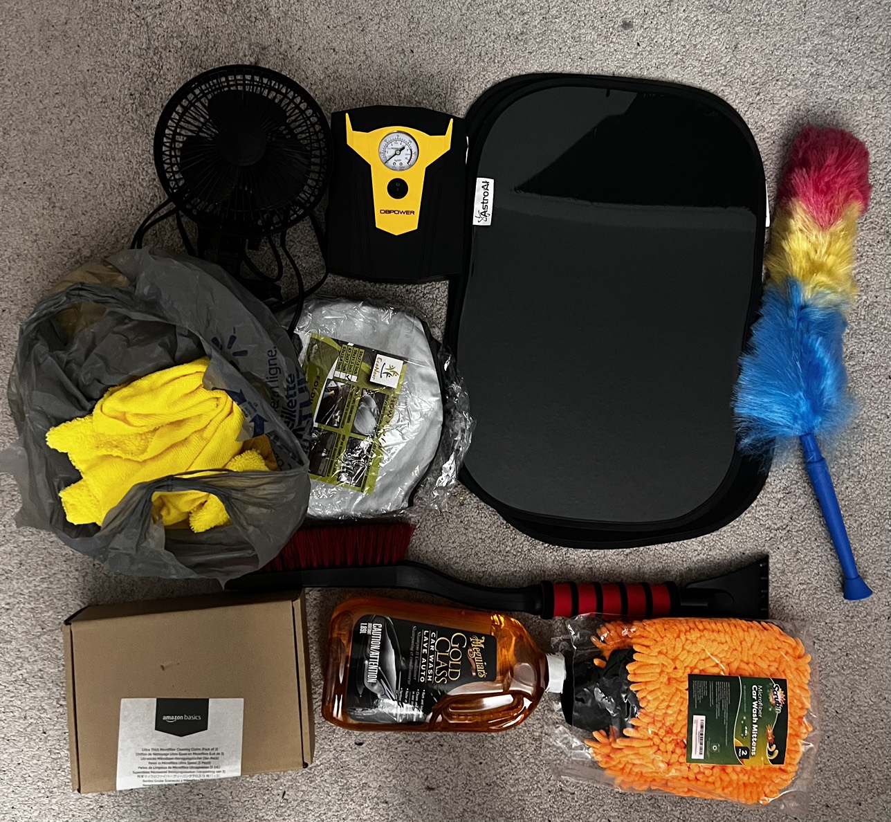 272Giveaway of car accessories and cleaning products. Lightly or never used items. Tire pressure compressor, small fan, Sun shade cover for windshield, Sun shade cover for windows (x4), microfibre cleaning cloth, snow scraper, car wash liquid, car wash mittens. Pickup only. No reservations.