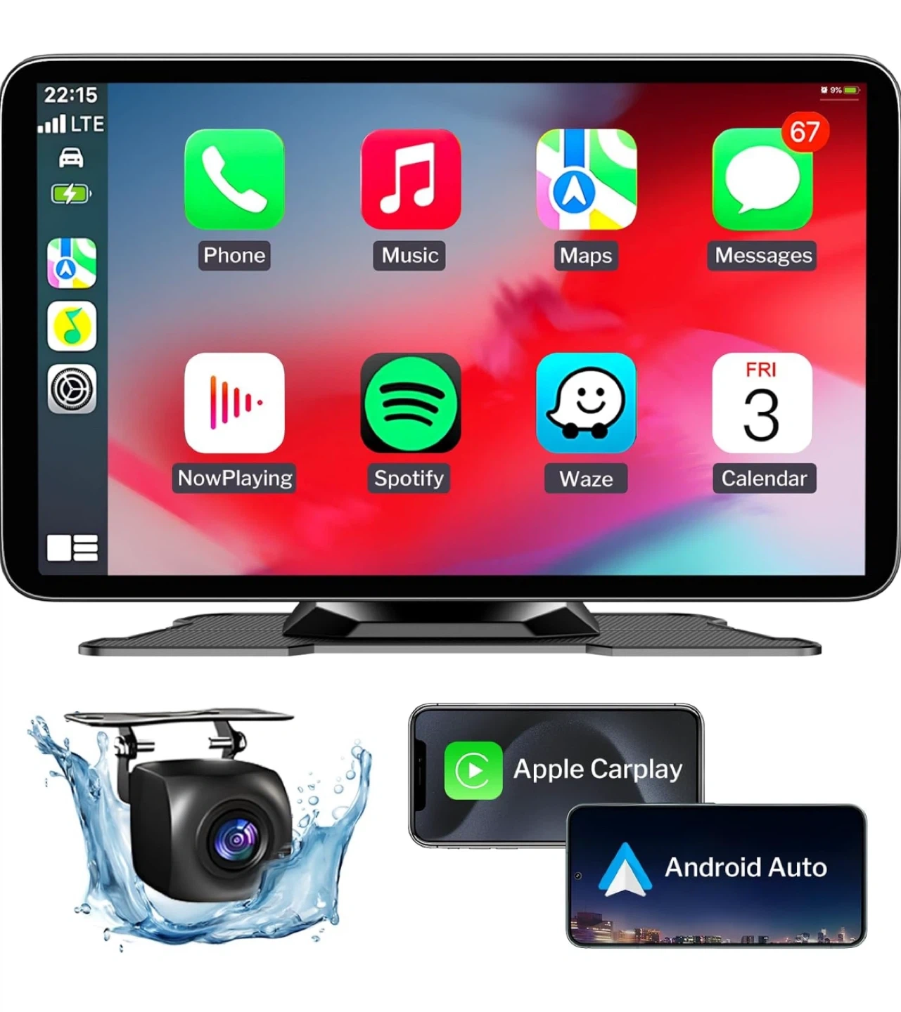 9Selling a car multimedia player compatible with both Apple CarPlay and Android Auto. It has a user-friendly interface with apps like Phone, Music, Maps, Spotify, and Waze readily accessible. The display also shows the date (Fri, 3rd). Great for upgrading your car's entertainment system!