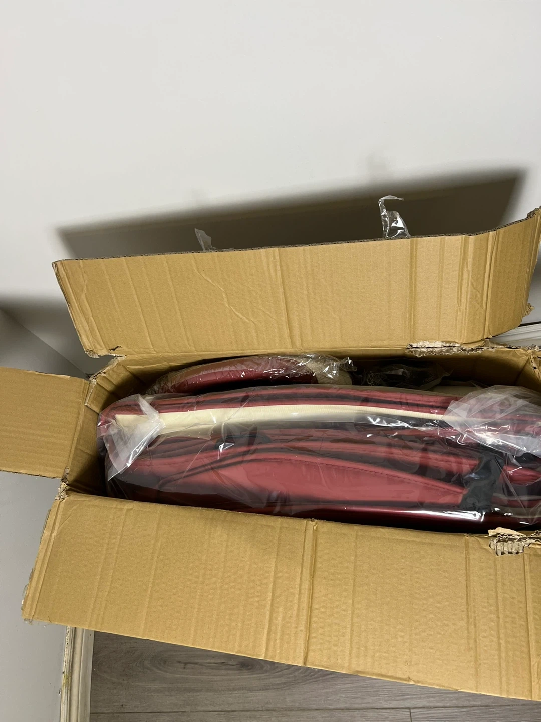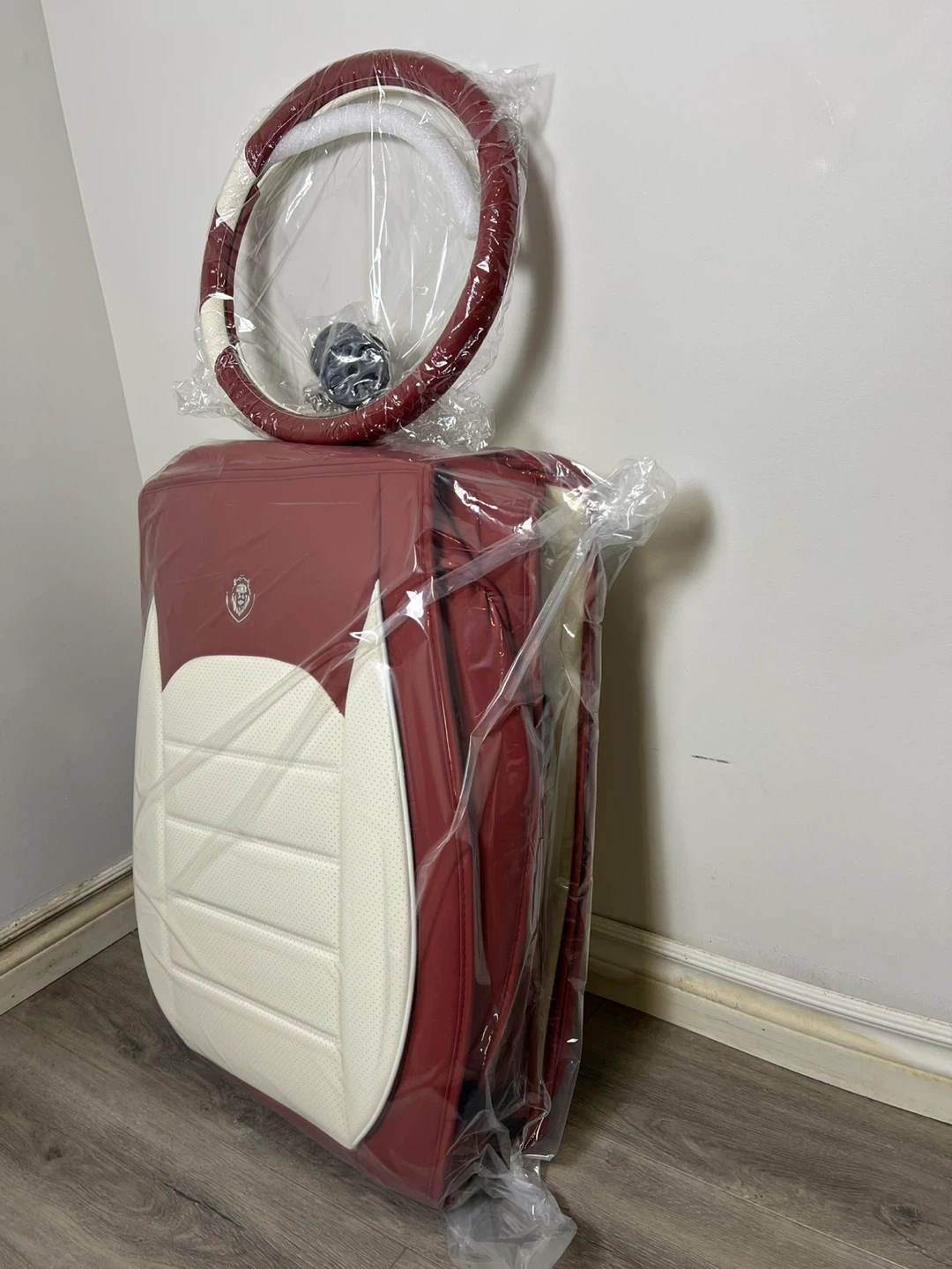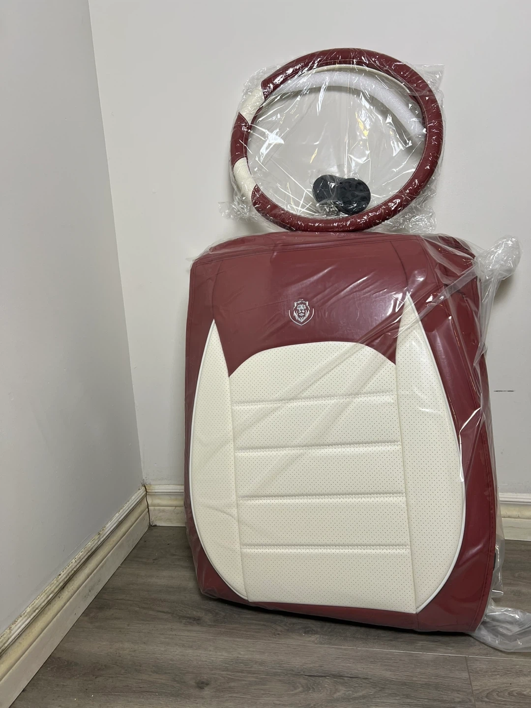 I have a brand new set of car seat covers for sale! This set comes in a stylish burgundy and white colour scheme and includes covers for the front and rear seats, as well as a steering wheel cover. It also comes with the original box. Perfect for upgrading your car's interior!