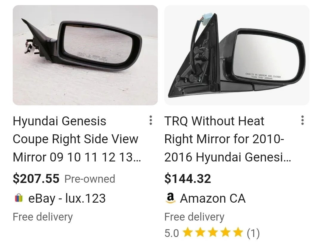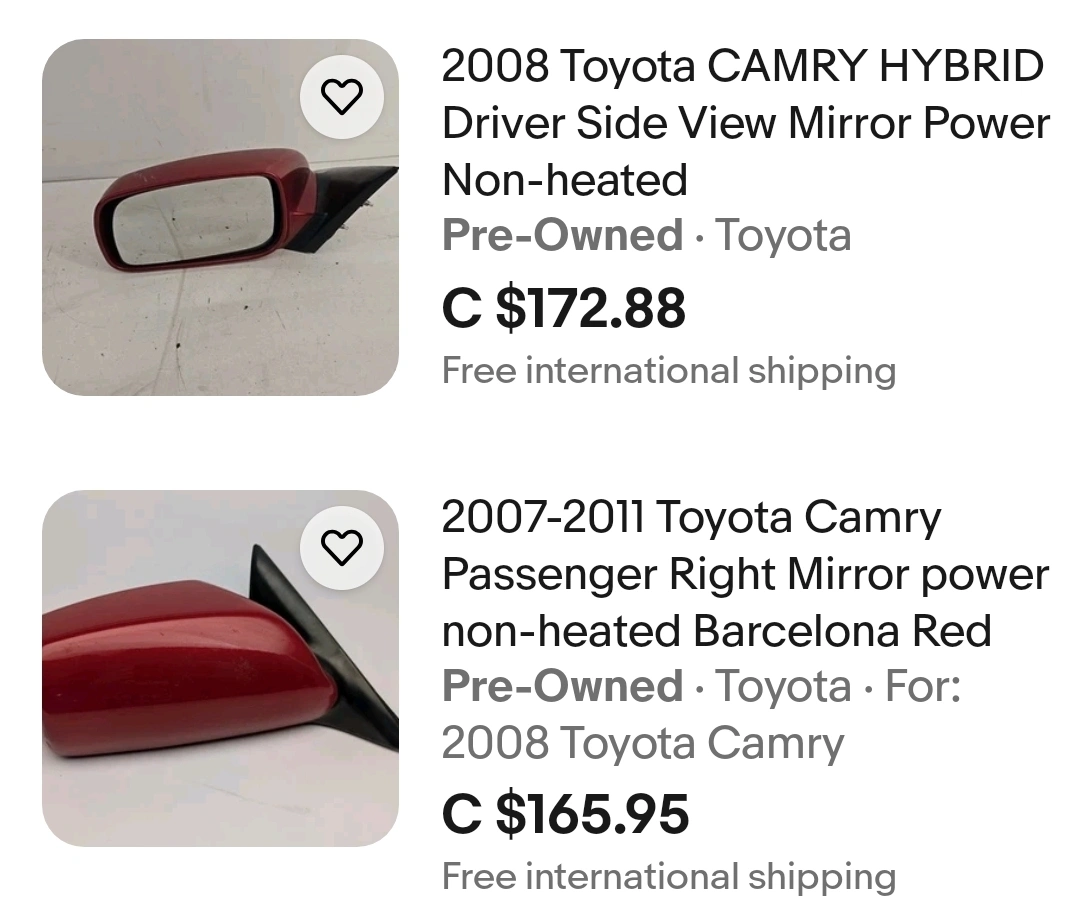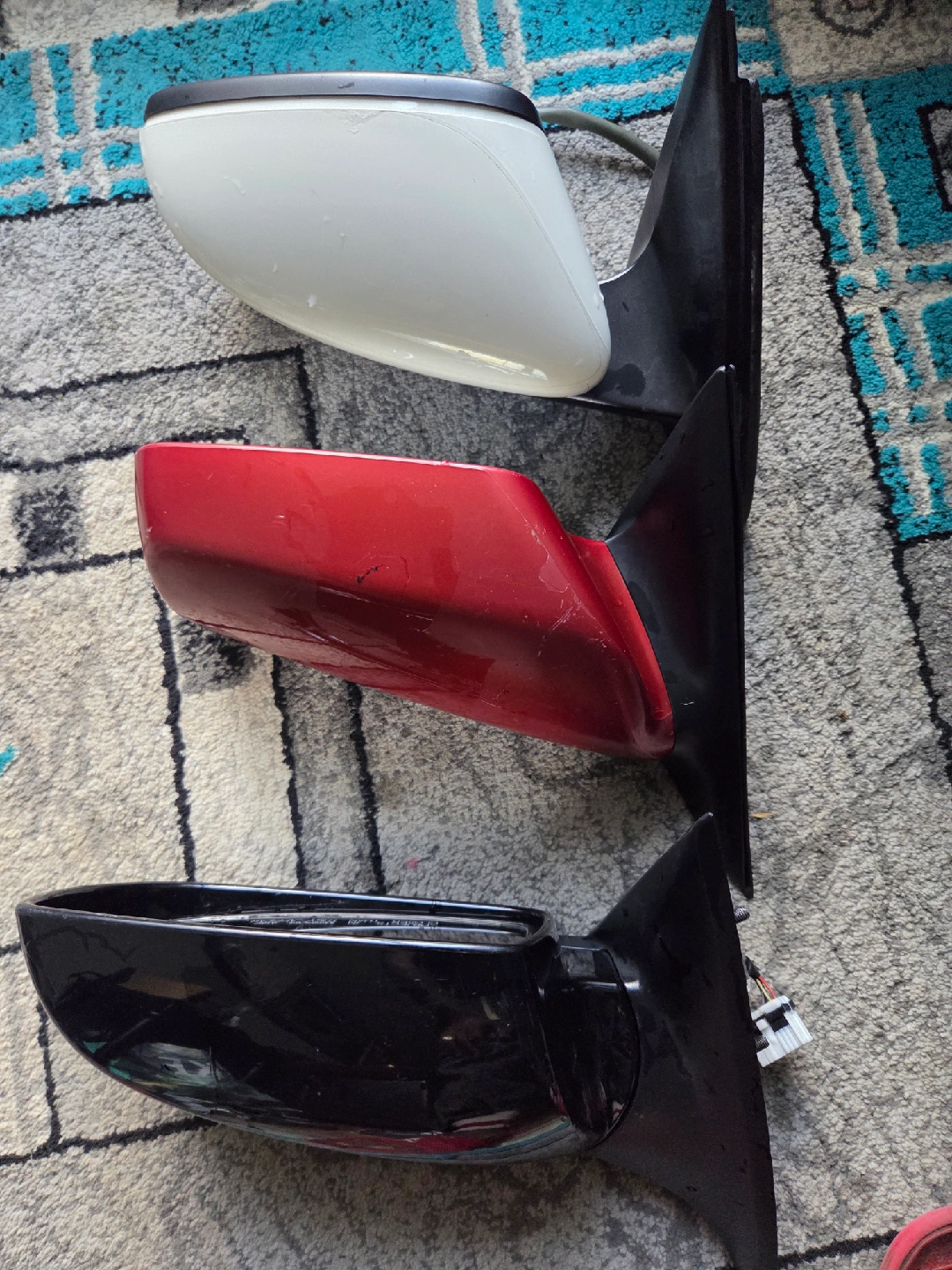 Selling a few car side mirrors in different colours: red, white, and black. They show some signs of wear, like scratches. Please take a look at the pictures for details! 2005 to 2010 red toyota camery passenger 2011 to 2013 white jetta passenger 2011 to 2013 black Hyundai Genesis passenger