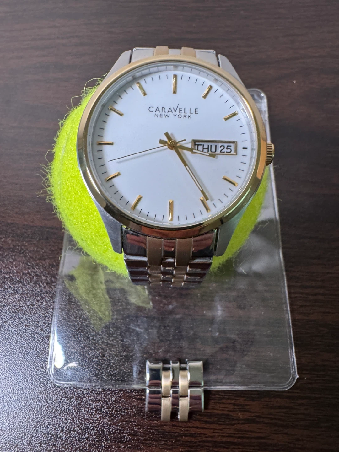 Bought it yesterday, selling today. no scratches Selling a Caravelle New York watch in a stylish two-tone design. It's in great condition and comes with extra links. The watch face is white with gold accents, and it displays the day of the week. Perfect for adding a touch of elegance to your everyday look!