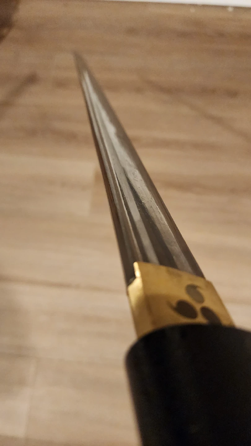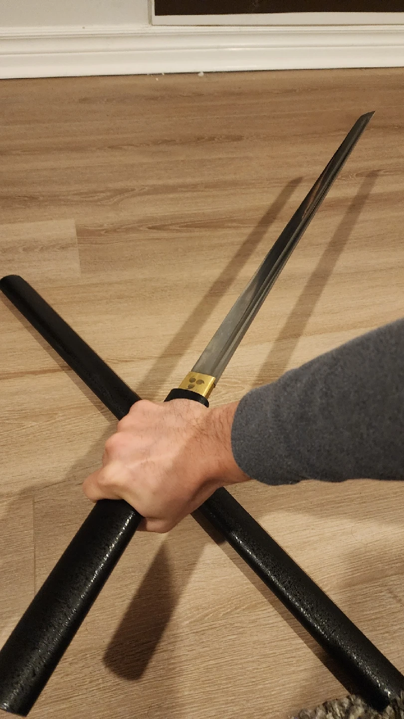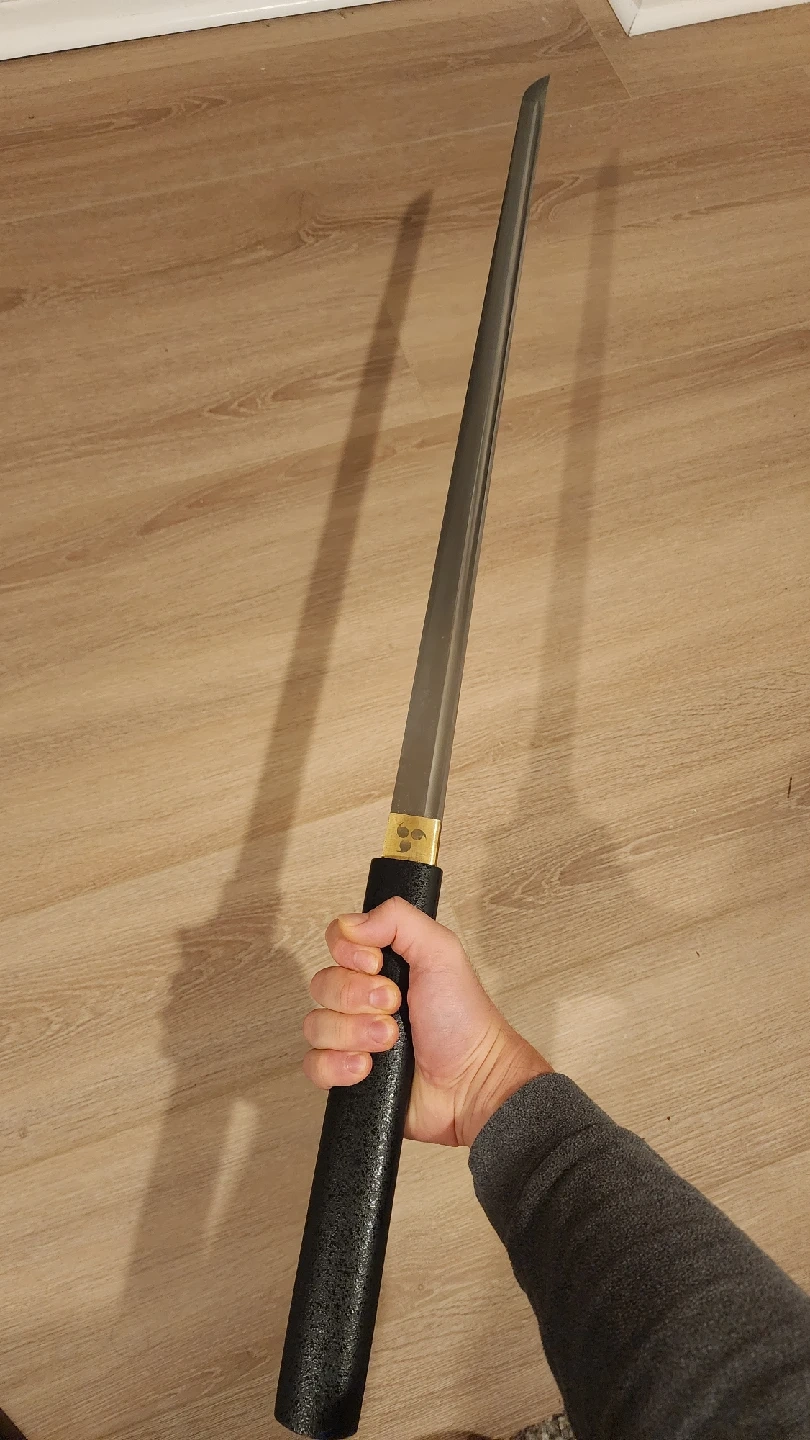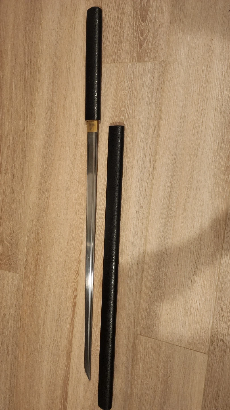 651Steel forged straight Katana, new condition, never used, only displayed. This is a fully functional steel Katana sword, unlike many other listings here with a replica aluminum blade, this is a real fully fictional sword. about 40 Inches long, full tang and made of high quality steel, very heavy and sharp.