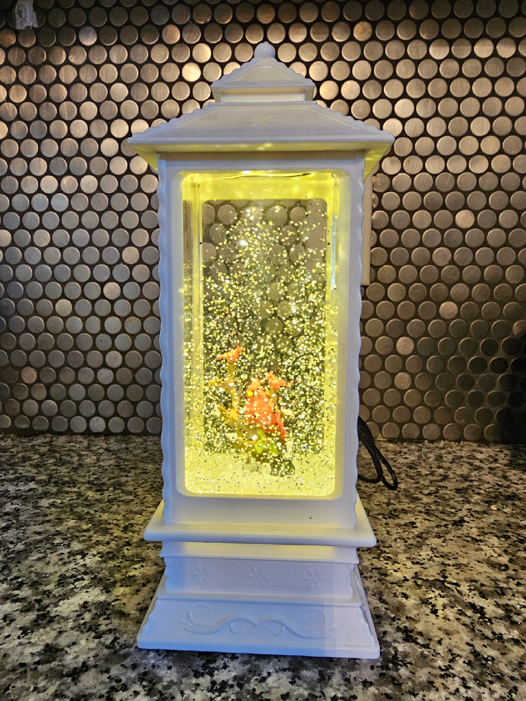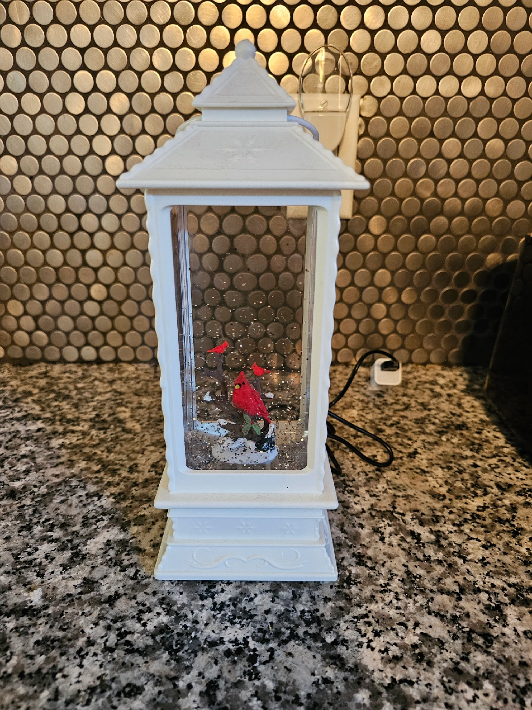 This is a cute snow globe lantern with cardinals inside. It would be a great addition to your holiday decor! brand new in box. reg 49.95 asking $35